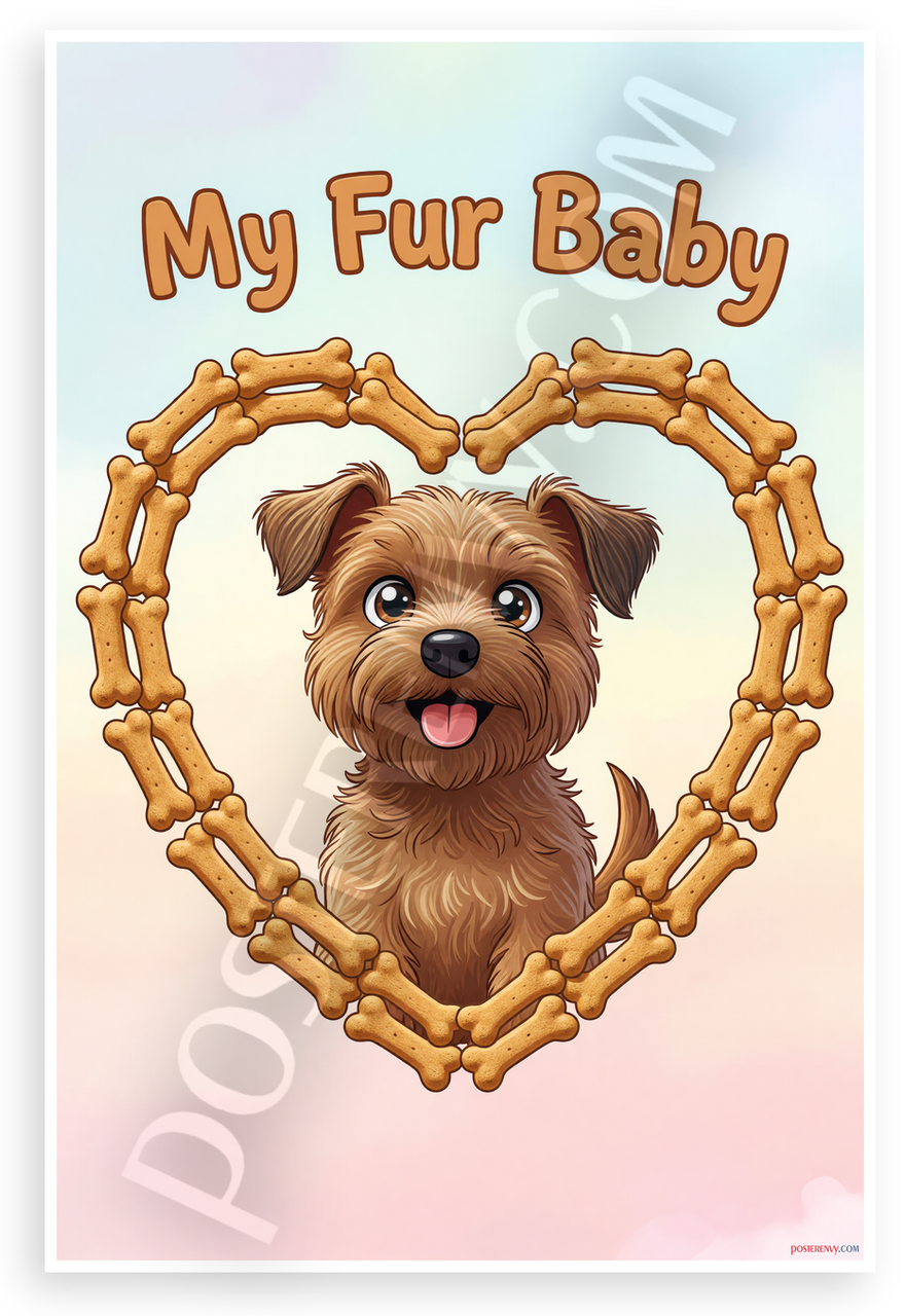 This 12x18 inch poster is printed on premium, durable paper. Proudly Made in the USA by PosterEnvy. The perfect size for any room. PosterEnvy is a family owned business, delivering top-notch posters around the world for over 20 years. Our posters are designed to last — they won't fade or pucker for years of enjoyment. Every poster features crisp, vivid artwork. We are a solar powered company. This whimsical cartoon poster showcases a cute Border Terrier puppy framed in a heart of dog bone treats with 'My Fur Baby' text, perfect for pet lovers. Its playful design adds joy to any pet-themed space.