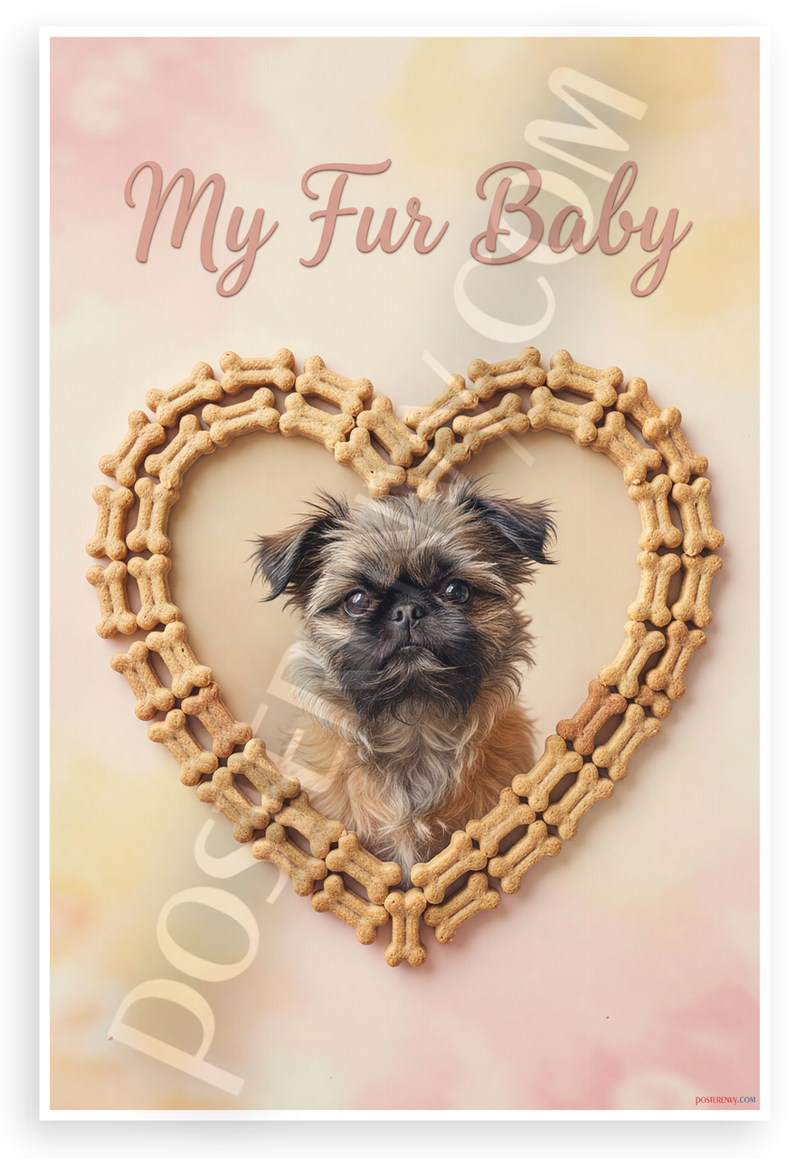 This 12x18 inch poster is printed on premium, durable paper. Proudly Made in the USA by PosterEnvy. The perfect size for any room. PosterEnvy is a family owned business, delivering top-notch posters around the world for over 20 years. Our posters are designed to last — they won't fade or pucker for years of enjoyment. Every poster features crisp, vivid artwork. We are a solar powered company. Featuring a cute Brussels Griffon puppy framed in a heart of tiny dog bone treats with 'My Fur Baby' text, in soft pastel pink, yellow, and warm nostalgic style evoking pet love and family bonds.