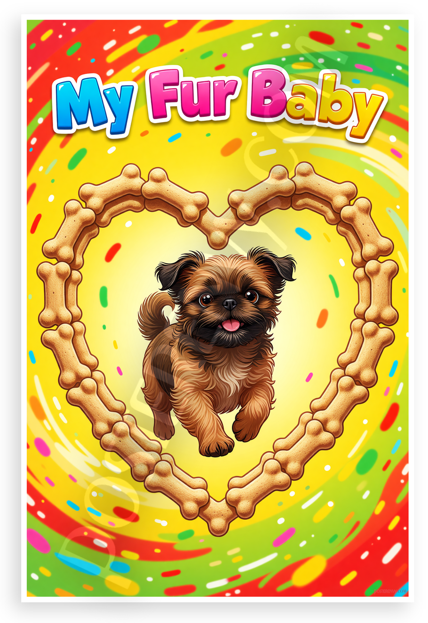 This 12x18 inch poster is printed on premium, durable paper. Proudly Made in the USA by PosterEnvy. The perfect size for any room. PosterEnvy is a family owned business, delivering top-notch posters around the world for over 20 years. Our posters are designed to last — they won't fade or pucker for years of enjoyment. Every poster features crisp, vivid artwork. We are a solar powered company. This vibrant poster showcases a cute Brussels Griffon puppy playfully framed in a heart of dog bone treats under the fun text 'My Fur Baby,' bursting with bright rainbow colors and whimsical energy. Ideal for pet lovers' homes or nurseries.