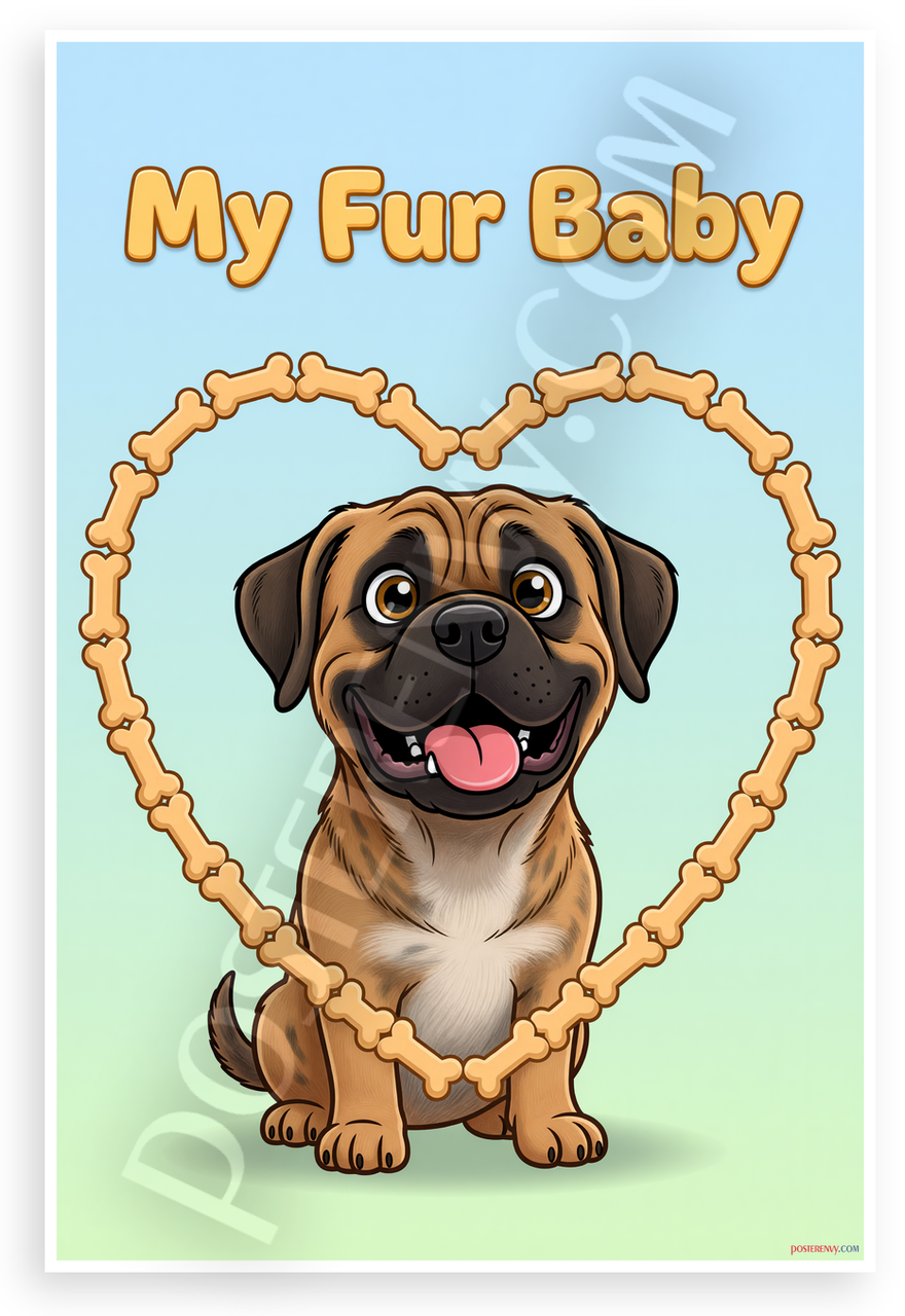 This 12x18 inch poster is printed on premium, durable paper. Proudly Made in the USA by PosterEnvy. The perfect size for any room. PosterEnvy is a family owned business, delivering top-notch posters around the world for over 20 years. Our posters are designed to last — they won't fade or pucker for years of enjoyment. Every poster features crisp, vivid artwork. We are a solar powered company. This whimsical cartoon poster showcases a cute Bullmastiff puppy framed in a heart of dog bones under 'My Fur Baby' text, perfect for pet lovers. Its playful colors and fun vibe brighten any space.