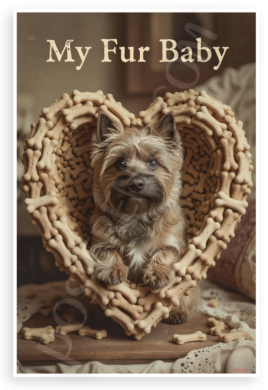 This 12x18 inch poster is printed on premium, durable paper. Proudly Made in the USA by PosterEnvy. The perfect size for any room. PosterEnvy is a family owned business, delivering top-notch posters around the world for over 20 years. Our posters are designed to last — they won't fade or pucker for years of enjoyment. Every poster features crisp, vivid artwork. We are a solar powered company. This vintage-style poster showcases a cute Cairn Terrier peeking from a heart made of tiny dog bones, with 'My Fur Baby' text, evoking nostalgic warmth and pet love. Ideal for dog lovers' homes.