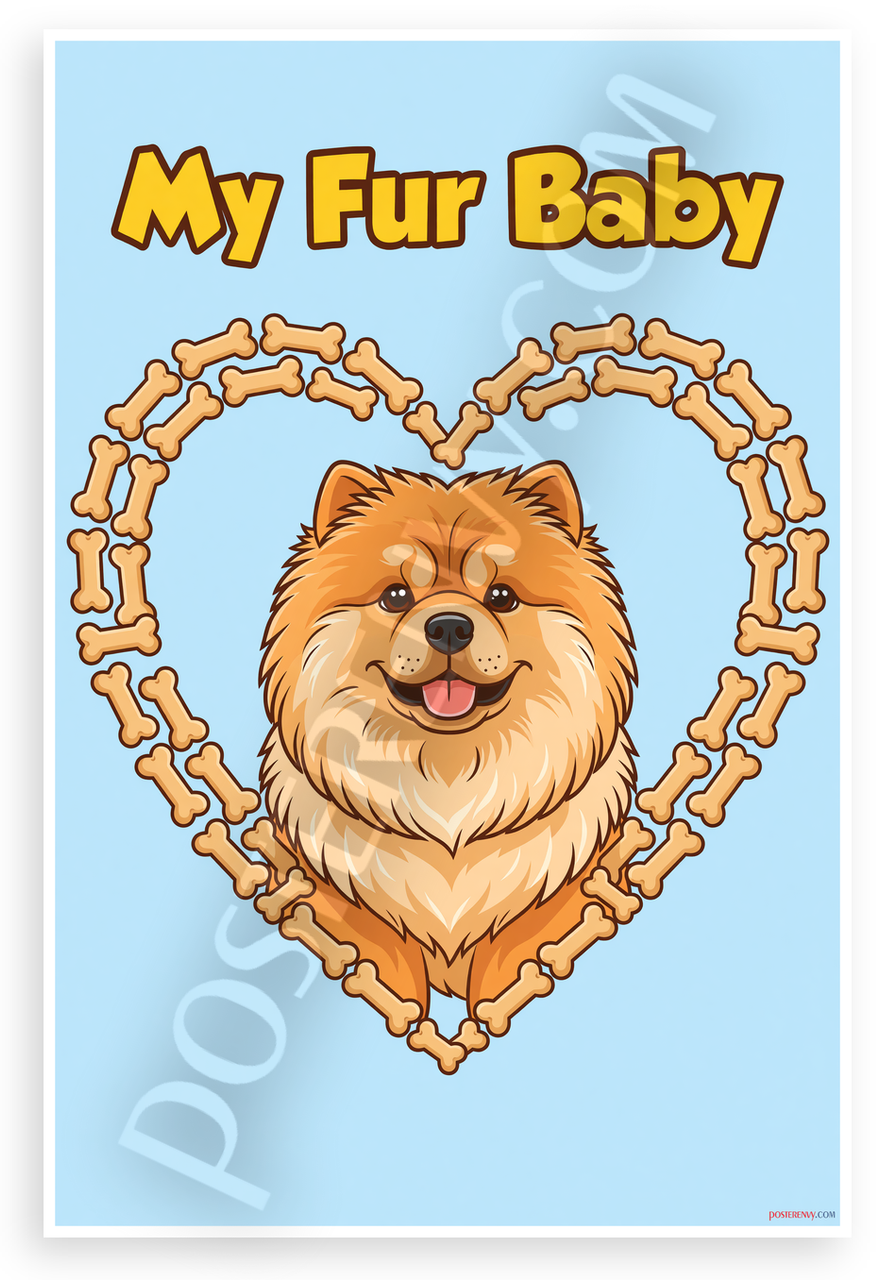 This 12x18 inch poster is printed on premium, durable paper. Proudly Made in the USA by PosterEnvy. The perfect size for any room. PosterEnvy is a family owned business, delivering top-notch posters around the world for over 20 years. Our posters are designed to last — they won't fade or pucker for years of enjoyment. Every poster features crisp, vivid artwork. We are a solar powered company. This playful cartoon poster showcases a fluffy Chow Chow dog inside a heart made of dog bones, topped with 'My Fur Baby' text in vibrant yellow. Ideal for pet lovers celebrating their furry companions.