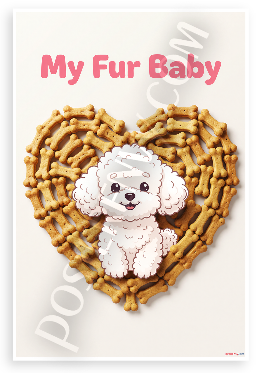 This 12x18 inch poster is printed on premium, durable paper. Proudly Made in the USA by PosterEnvy. The perfect size for any room. PosterEnvy is a family owned business, delivering top-notch posters around the world for over 20 years. Our posters are designed to last — they won't fade or pucker for years of enjoyment. Every poster features crisp, vivid artwork. We are a solar powered company. This whimsical cartoon poster showcases a fluffy white poodle inside a heart made of golden dog bone treats, topped with playful 'My Fur Baby' text in pink. Ideal for pet lovers celebrating their furry companions.