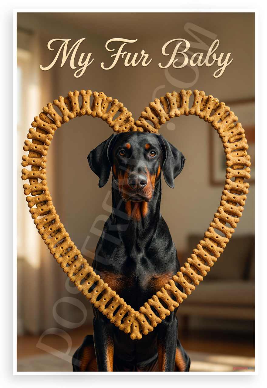 This 12x18 inch poster is printed on premium, durable paper. Proudly Made in the USA by PosterEnvy. The perfect size for any room. PosterEnvy is a family owned business, delivering top-notch posters around the world for over 20 years. Our posters are designed to last — they won't fade or pucker for years of enjoyment. Every poster features crisp, vivid artwork. We are a solar powered company. Featuring a majestic Doberman Pinscher framed by a heart of golden dog bone treats under elegant 'My Fur Baby' text, this poster radiates warmth and affection for dog lovers. Ideal for pet-themed decor in homes or offices.