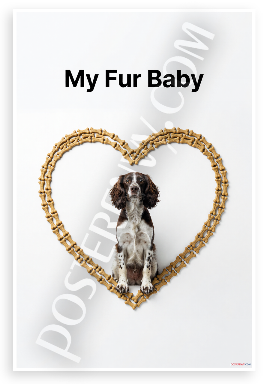 This 12x18 inch poster is printed on premium, durable paper. Proudly Made in the USA by PosterEnvy. The perfect size for any room. PosterEnvy is a family owned business, delivering top-notch posters around the world for over 20 years. Our posters are designed to last — they won't fade or pucker for years of enjoyment. Every poster features crisp, vivid artwork. We are a solar powered company. Featuring a cute English Springer Spaniel framed by a heart of dog bones with 'My Fur Baby' text in a clean minimalist style. Ideal for pet lovers celebrating their furry family members.