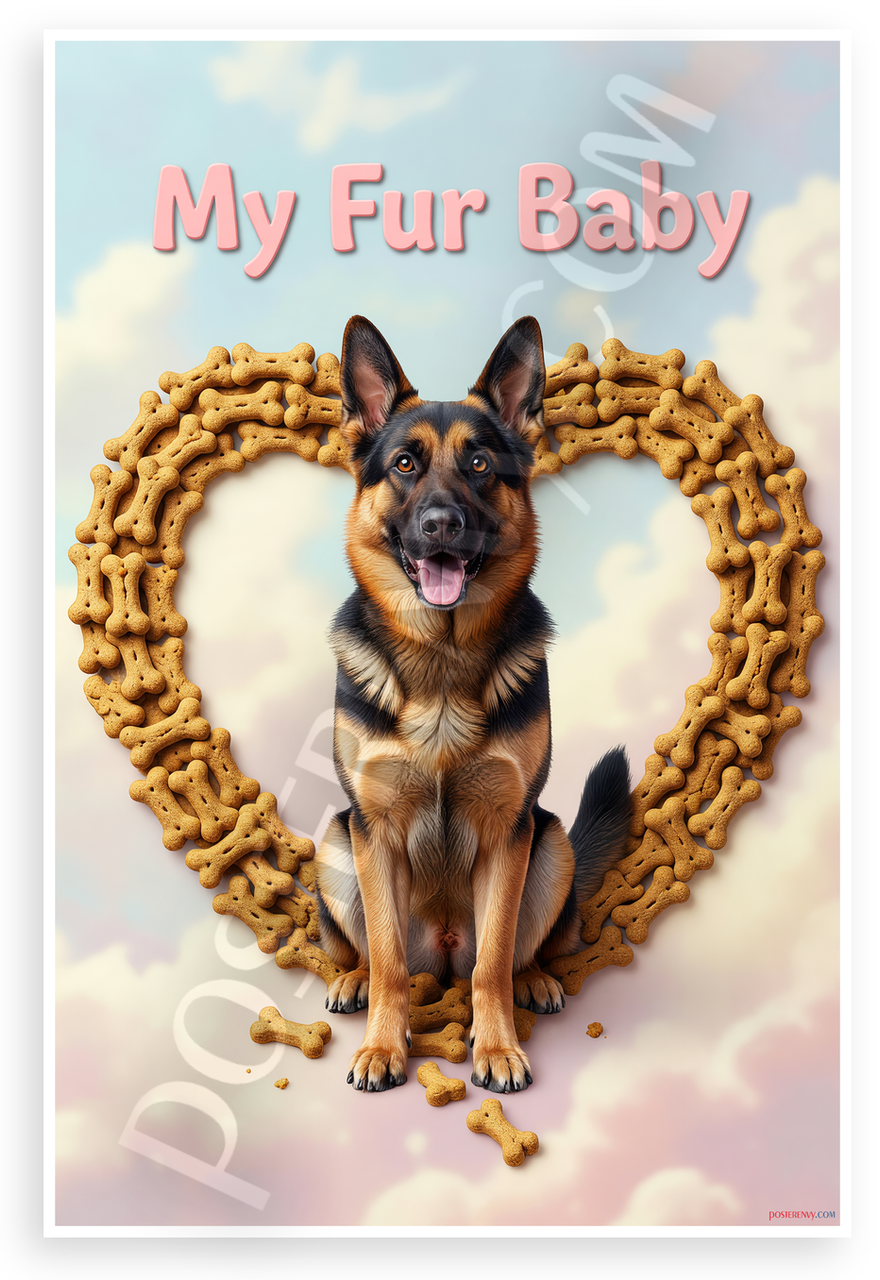 This 12x18 inch poster is printed on premium, durable paper. Proudly Made in the USA by PosterEnvy. The perfect size for any room. PosterEnvy is a family owned business, delivering top-notch posters around the world for over 20 years. Our posters are designed to last — they won't fade or pucker for years of enjoyment. Every poster features crisp, vivid artwork. We are a solar powered company. This whimsical design showcases a smiling German Shepherd framed by a heart of dog bone treats, with playful pink 'My Fur Baby' text atop a dreamy blue-pink cloudy background, capturing pure pet love and affection.