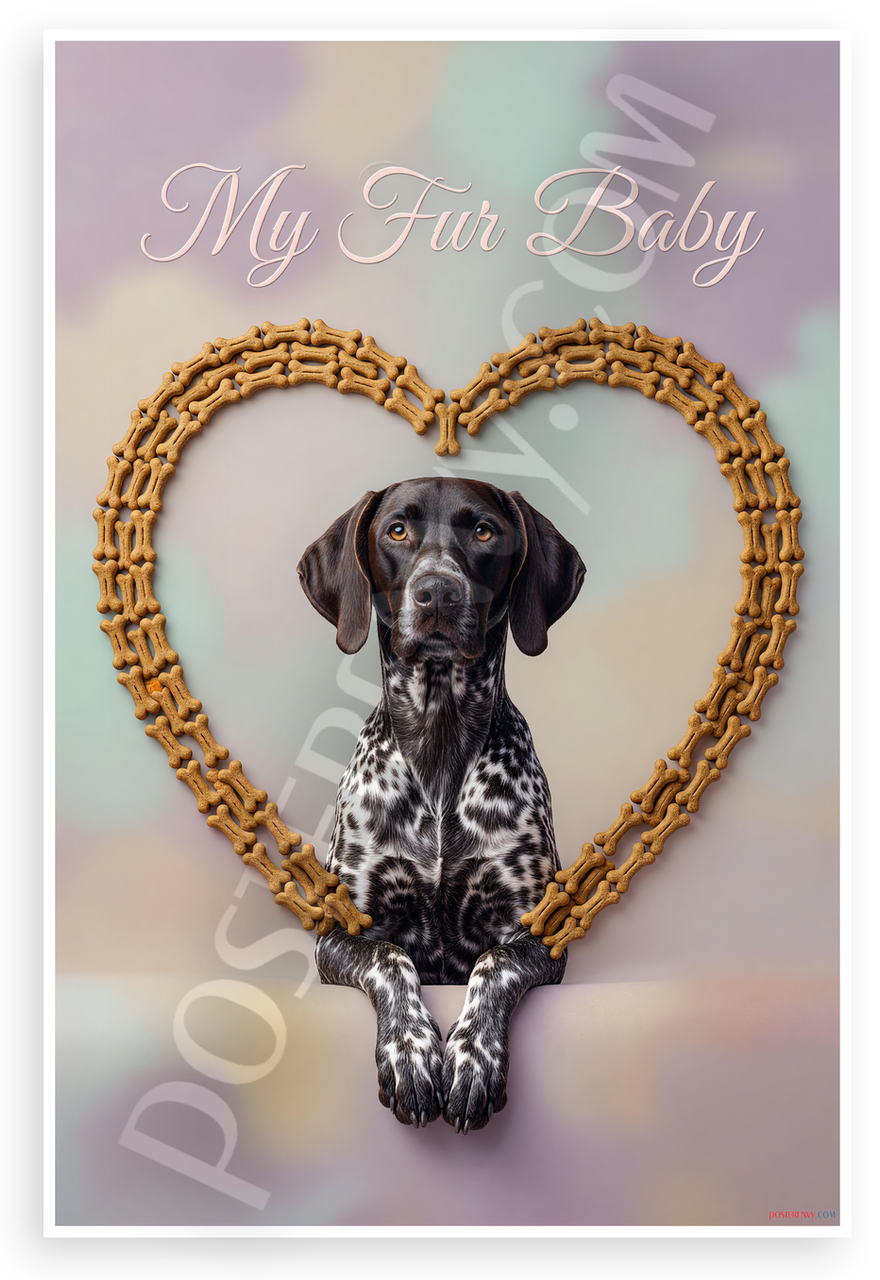 This 12x18 inch poster is printed on premium, durable paper. Proudly Made in the USA by PosterEnvy. The perfect size for any room. PosterEnvy is a family owned business, delivering top-notch posters around the world for over 20 years. Our posters are designed to last — they won't fade or pucker for years of enjoyment. Every poster features crisp, vivid artwork. We are a solar powered company. Features an elegant German Shorthaired Pointer framed in a heart of dog bones with 'My Fur Baby' text, soft pastel background, and serene mood. Ideal for pet lovers' homes.