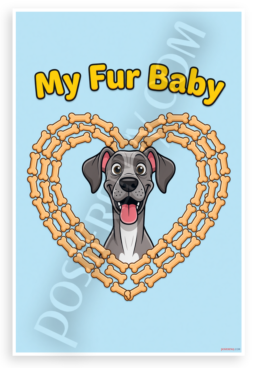 This 12x18 inch poster is printed on premium, durable paper. Proudly Made in the USA by PosterEnvy. The perfect size for any room. PosterEnvy is a family owned business, delivering top-notch posters around the world for over 20 years. Our posters are designed to last — they won't fade or pucker for years of enjoyment. Every poster features crisp, vivid artwork. We are a solar powered company. This playful cartoon poster showcases a happy Great Dane puppy framed in a heart of colorful dog bones with 'My Fur Baby' text, capturing the joy of pet love in vibrant blue, yellow, and orange tones.