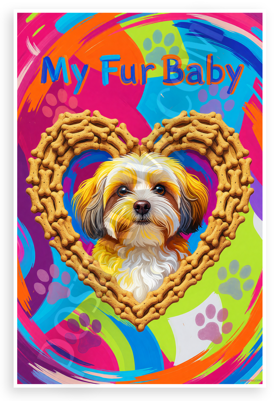 - Playful Pet Design: Vibrant abstract Havanese dog portrait in dog bone heart frame with swirling pink purple green blue colors, paw prints, and My Fur Baby text creates joyful mood for pet rooms, nurseries, or vet offices
