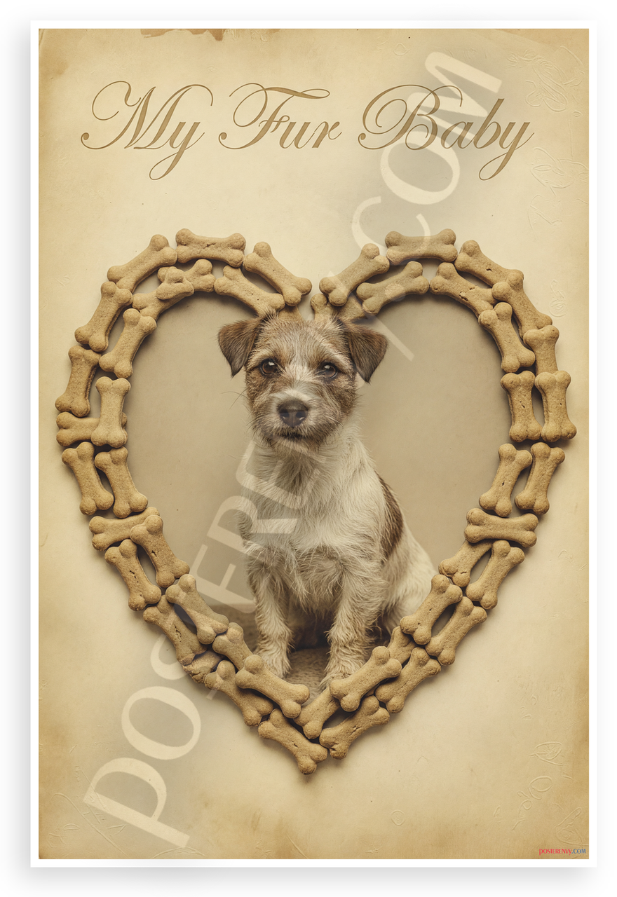 This 12x18 inch poster is printed on premium, durable paper. Proudly Made in the USA by PosterEnvy. The perfect size for any room. PosterEnvy is a family owned business, delivering top-notch posters around the world for over 20 years. Our posters are designed to last — they won't fade or pucker for years of enjoyment. Every poster features crisp, vivid artwork. We are a solar powered company. This vintage-style poster showcases a cute Jack Russell Terrier framed in a heart of dog bone treats with 'My Fur Baby' text, evoking nostalgic sentimentality for pet lovers. Ideal for adding warmth to any pet-themed space.