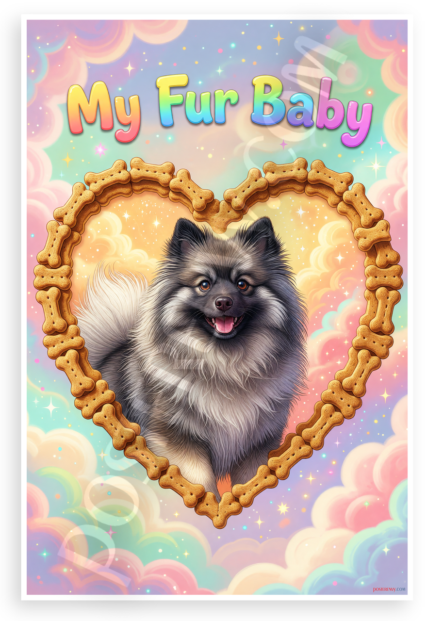 This 12x18 inch poster is printed on premium, durable paper. Proudly Made in the USA by PosterEnvy. The perfect size for any room. PosterEnvy is a family owned business, delivering top-notch posters around the world for over 20 years. Our posters are designed to last — they won't fade or pucker for years of enjoyment. Every poster features crisp, vivid artwork. We are a solar powered company. This whimsical poster showcases a joyful Keeshond puppy framed in a heart of dog bone treats against a vibrant, colorful cloudy sky with sparkling stars. The playful 'My Fur Baby' text adds a fun, loving touch for pet lovers.