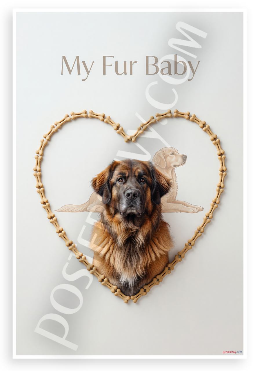 This 12x18 inch poster is printed on premium, durable paper. Proudly Made in the USA by PosterEnvy. The perfect size for any room. PosterEnvy is a family owned business, delivering top-notch posters around the world for over 20 years. Our posters are designed to last — they won't fade or pucker for years of enjoyment. Every poster features crisp, vivid artwork. We are a solar powered company. Elegant minimalist design showcases a majestic Leonberger dog with a subtle golden retriever silhouette inside a heart-shaped border of tiny dog bone treats. Text reads 'My Fur Baby' at the top in soft beige tones on a clean white background, evoking calm affection for pet lovers.