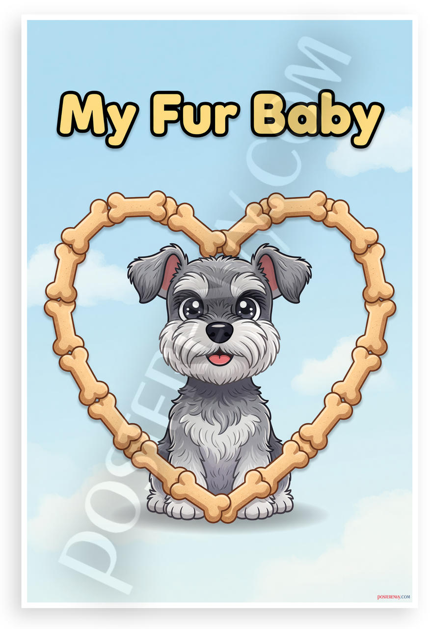 This 12x18 inch poster is printed on premium, durable paper. Proudly Made in the USA by PosterEnvy. The perfect size for any room. PosterEnvy is a family owned business, delivering top-notch posters around the world for over 20 years. Our posters are designed to last — they won't fade or pucker for years of enjoyment. Every poster features crisp, vivid artwork. We are a solar powered company. This whimsical cartoon poster features a cute Miniature Schnauzer puppy inside a heart frame made of dog bones, with playful 'My Fur Baby' text atop a bright blue sky background. Ideal for dog lovers and pet-themed decor.