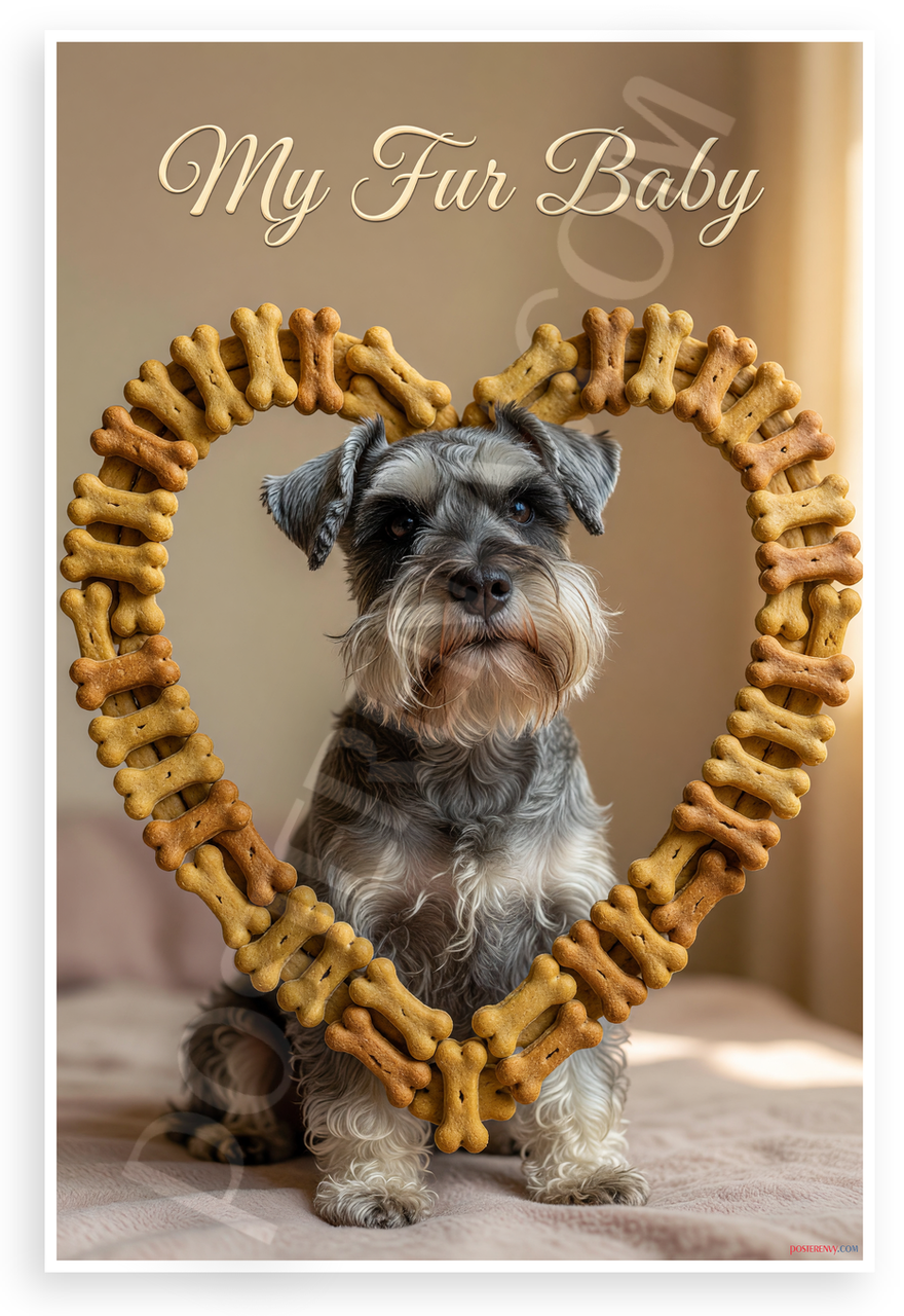 This 12x18 inch poster is printed on premium, durable paper. Proudly Made in the USA by PosterEnvy. The perfect size for any room. PosterEnvy is a family owned business, delivering top-notch posters around the world for over 20 years. Our posters are designed to last — they won't fade or pucker for years of enjoyment. Every poster features crisp, vivid artwork. We are a solar powered company. Features a lifelike Miniature Schnauzer with an affectionate expression, framed by a heart of tiny dog bone treats. Text 'My Fur Baby' adds a heartwarming touch in soft beige tones on a warm background.