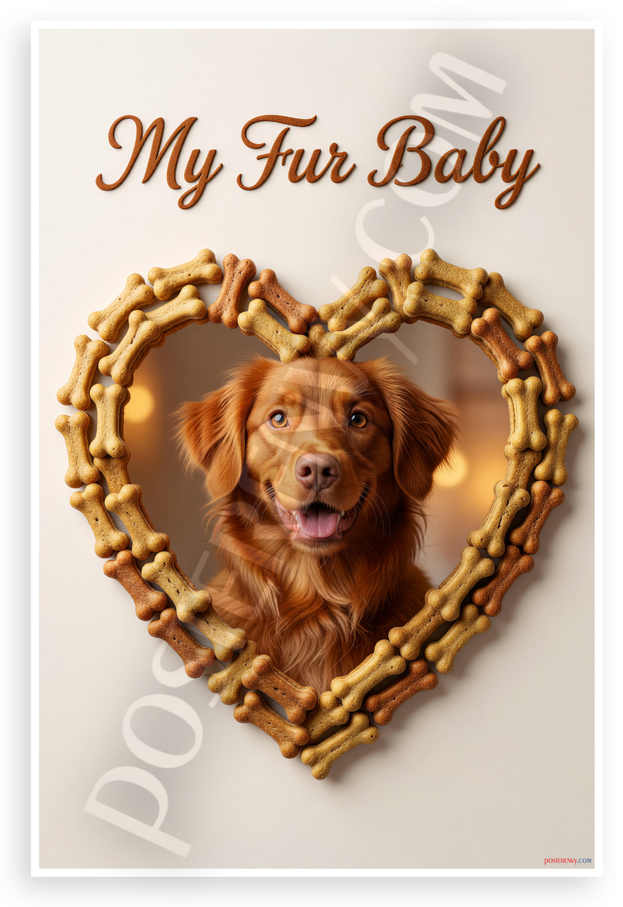 This 12x18 inch poster is printed on premium, durable paper. Proudly Made in the USA by PosterEnvy. The perfect size for any room. PosterEnvy is a family owned business, delivering top-notch posters around the world for over 20 years. Our posters are designed to last — they won't fade or pucker for years of enjoyment. Every poster features crisp, vivid artwork. We are a solar powered company. This heartfelt poster showcases a joyful Nova Scotia Duck Tolling Retriever framed in a heart of dog bone treats, with warm tones and affectionate 'My Fur Baby' text. Ideal for pet lovers' homes.