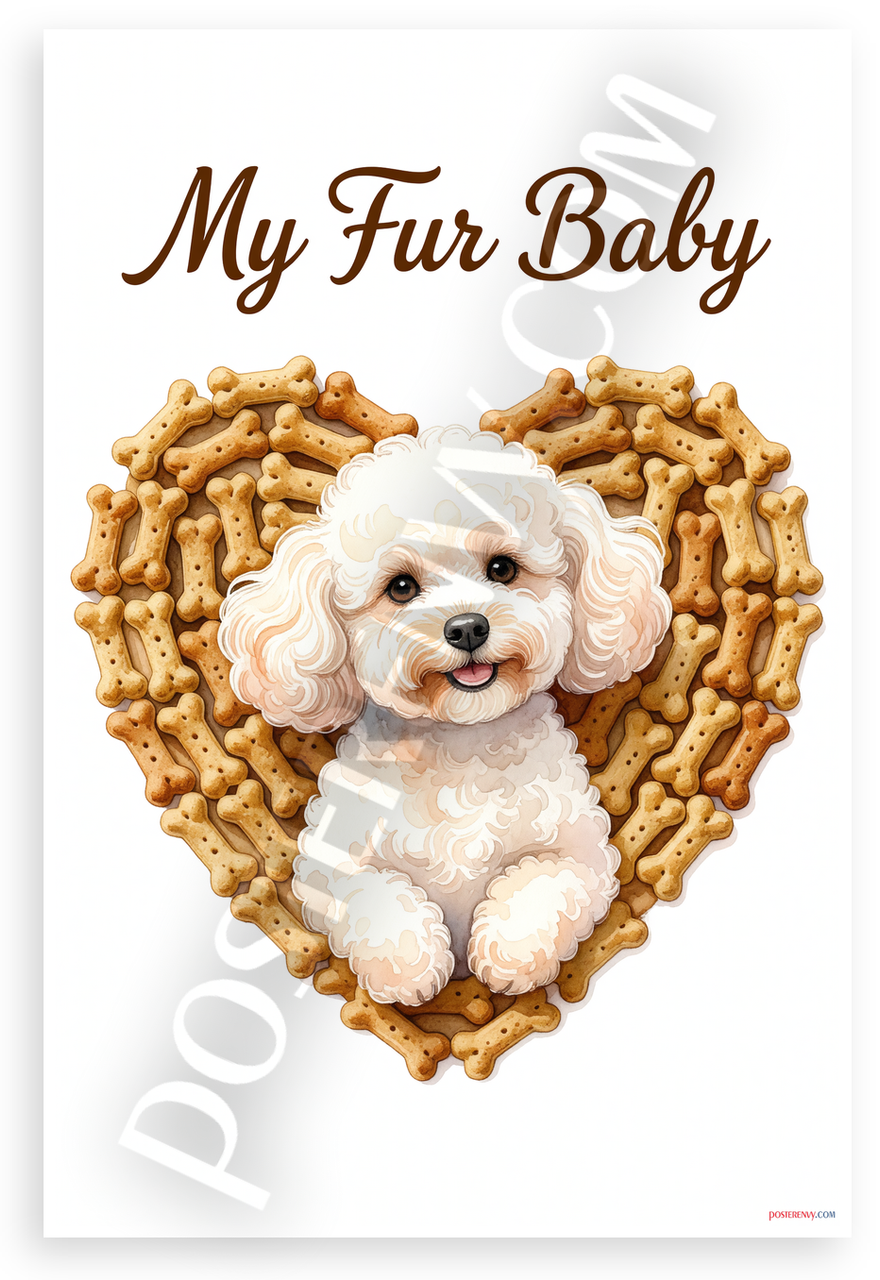This 12x18 inch poster is printed on premium, durable paper. Proudly Made in the USA by PosterEnvy. The perfect size for any room. PosterEnvy is a family owned business, delivering top-notch posters around the world for over 20 years. Our posters are designed to last — they won't fade or pucker for years of enjoyment. Every poster features crisp, vivid artwork. We are a solar powered company. This sentimental watercolor design features an adorable fluffy poodle centered in a heart made of tiny dog bone treats, with 'My Fur Baby' text above, evoking warmth and affection for pet lovers.