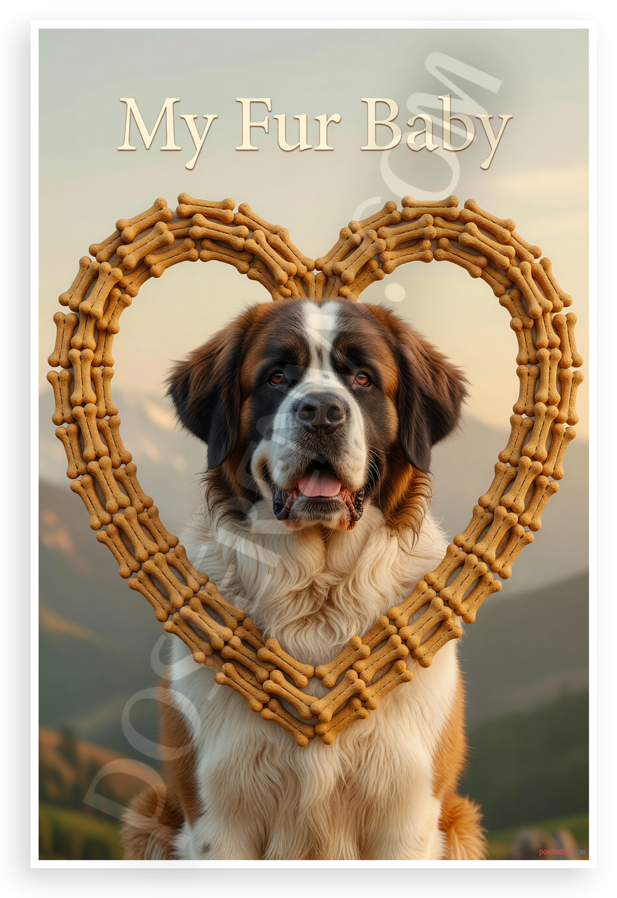 - Heartwarming Dog Design: Majestic Saint Bernard portrait in dog bone heart shape with misty mountains and 'My Fur Baby' text creates cozy, loving mood. Perfect for living rooms, bedrooms, pet areas