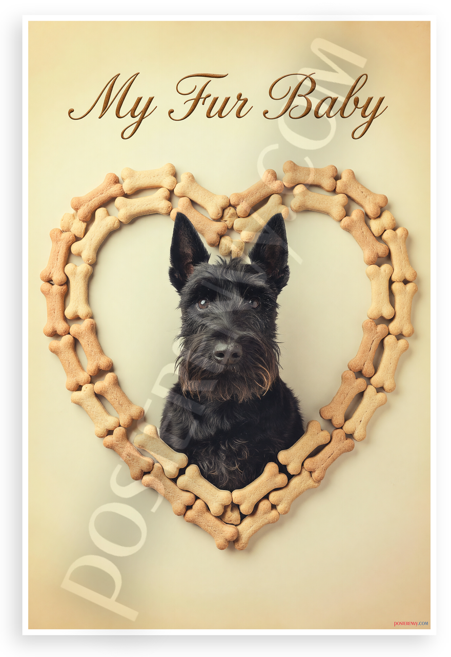 This 12x18 inch poster is printed on premium, durable paper. Proudly Made in the USA by PosterEnvy. The perfect size for any room. PosterEnvy is a family owned business, delivering top-notch posters around the world for over 20 years. Our posters are designed to last — they won't fade or pucker for years of enjoyment. Every poster features crisp, vivid artwork. We are a solar powered company. This charming vintage-style poster showcases a black Scottish Terrier framed by a heart of dog bones with 'My Fur Baby' text, evoking warm affection for pets in soft beige tones.