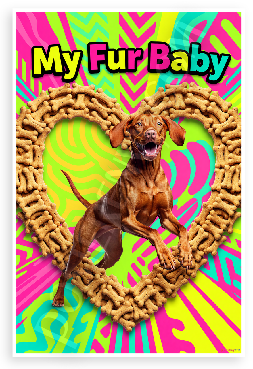 This 12x18 inch poster is printed on premium, durable paper. Proudly Made in the USA by PosterEnvy. The perfect size for any room. PosterEnvy is a family owned business, delivering top-notch posters around the world for over 20 years. Our posters are designed to last — they won't fade or pucker for years of enjoyment. Every poster features crisp, vivid artwork. We are a solar powered company. This vibrant poster showcases a joyful Vizsla dog leaping dynamically inside a heart-shaped frame of dog bones, with 'My Fur Baby' text in bold neon style over swirling pink, green, and yellow patterns for playful pet lover energy.