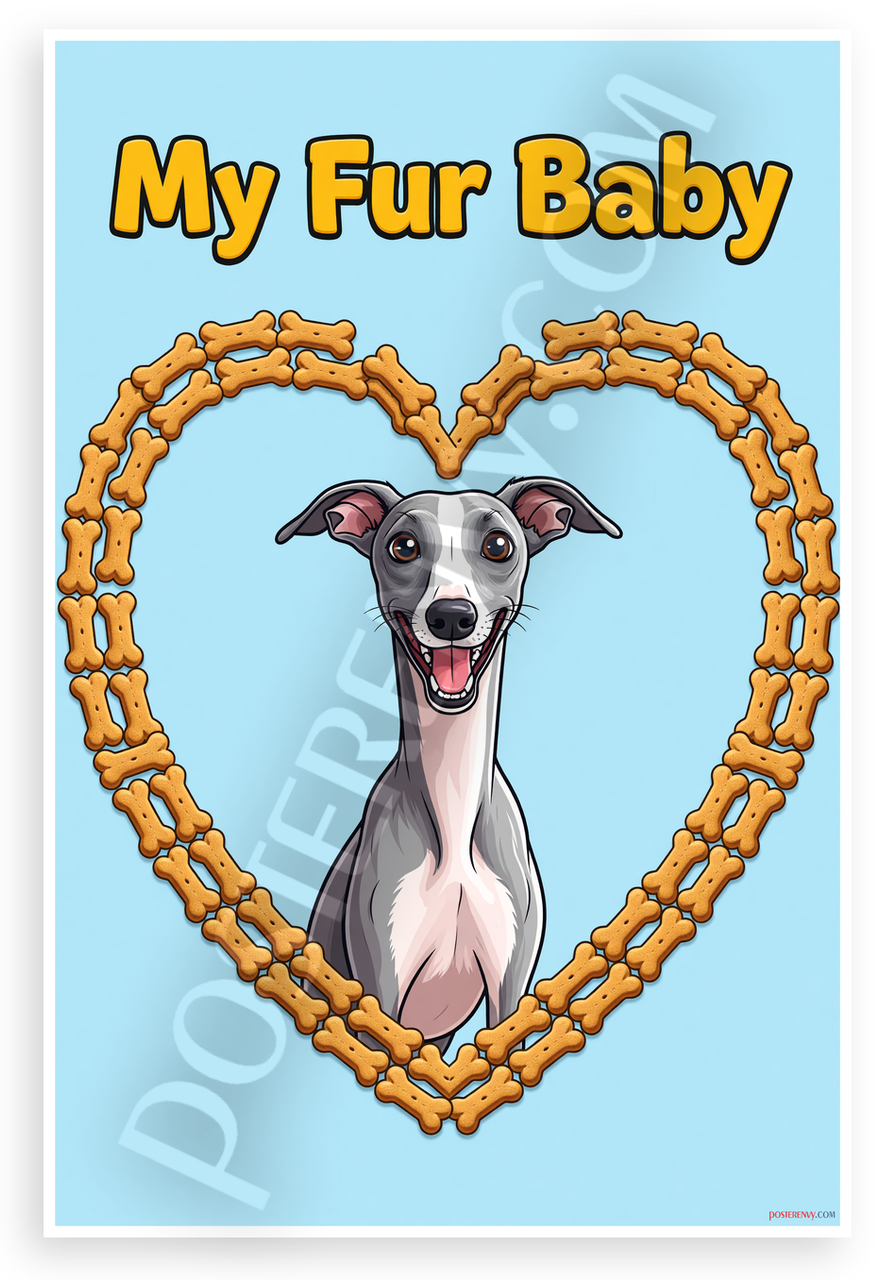 This 12x18 inch poster is printed on premium, durable paper. Proudly Made in the USA by PosterEnvy. The perfect size for any room. PosterEnvy is a family owned business, delivering top-notch posters around the world for over 20 years. Our posters are designed to last — they won't fade or pucker for years of enjoyment. Every poster features crisp, vivid artwork. We are a solar powered company. Celebrate pet love with this playful cartoon Whippet inside a heart frame of dog bones, topped with 'My Fur Baby' text in joyful yellow. Ideal for dog lovers' homes.
