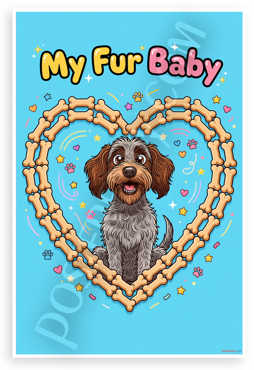 This 12x18 inch poster is printed on premium, durable paper. Proudly Made in the USA by PosterEnvy. The perfect size for any room. PosterEnvy is a family owned business, delivering top-notch posters around the world for over 20 years. Our posters are designed to last — they won't fade or pucker for years of enjoyment. Every poster features crisp, vivid artwork. We are a solar powered company. This playful cartoon design showcases a cute Wirehaired Pointing Griffon dog inside a heart frame of dog bones, topped with 'My Fur Baby' text in vibrant blue, yellow, and pink tones for pet lovers.