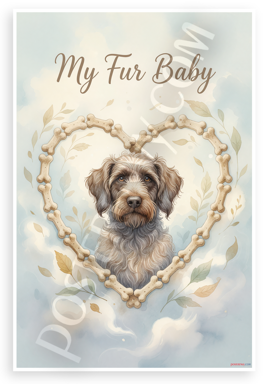 This 12x18 inch poster is printed on premium, durable paper. Proudly Made in the USA by PosterEnvy. The perfect size for any room. PosterEnvy is a family owned business, delivering top-notch posters around the world for over 20 years. Our posters are designed to last — they won't fade or pucker for years of enjoyment. Every poster features crisp, vivid artwork. We are a solar powered company. This serene watercolor-style poster features a Wirehaired Pointing Griffon centered in a heart frame of dog bones, with 'My Fur Baby' text and soft leaves on a dreamy blue background, evoking peaceful pet companionship.