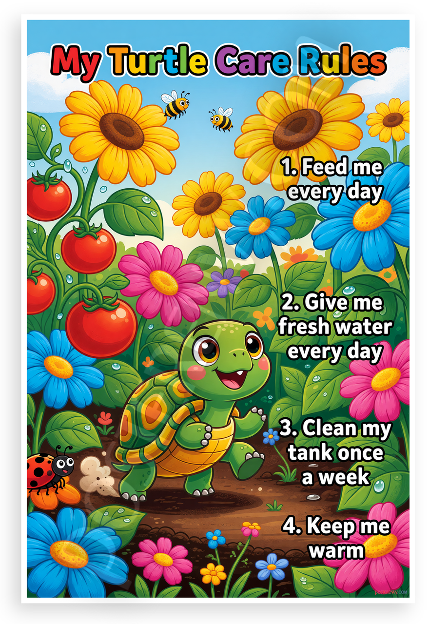 - Fun Turtle Care Design: Bright cartoon turtle amid sunflowers, tomatoes, bees and flowers teaches feeding, water, tank cleaning and warmth rules; perfect for kids bedroom or classroom