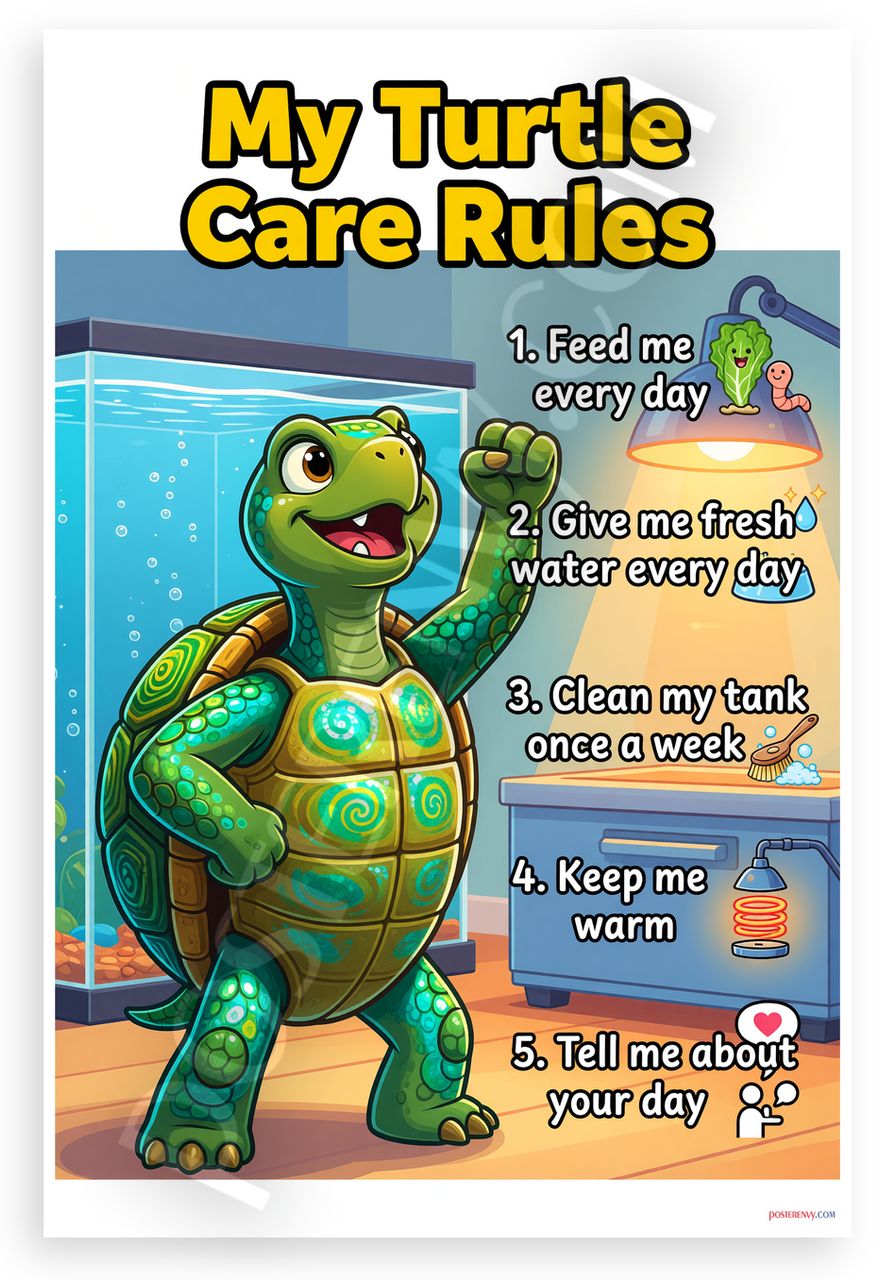 - Fun Turtle Care Design: Bright cartoon turtle with tank, water, food icons and rules creates playful educational mood, perfect for kids bedroom, classroom or playroom