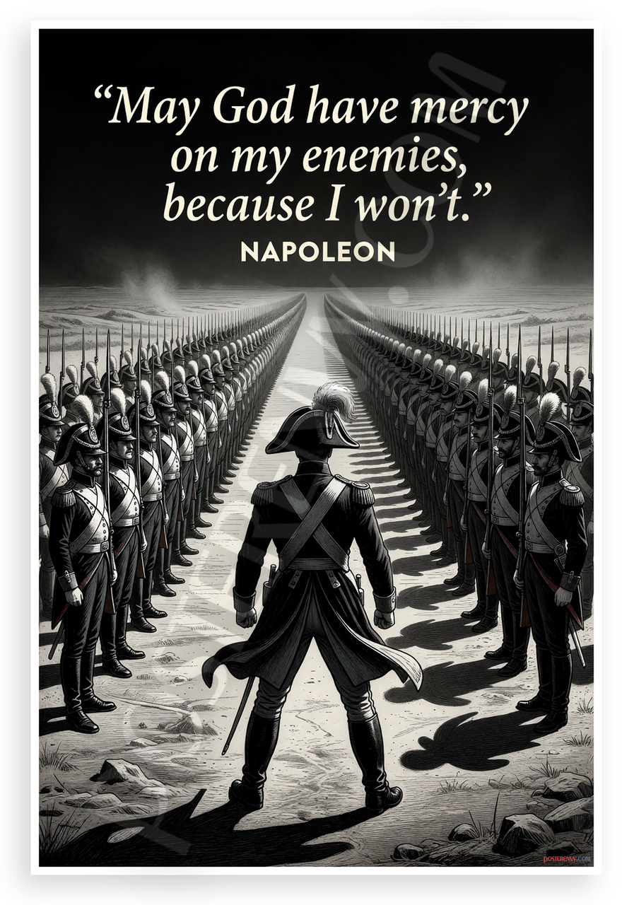 This 12x18 inch poster is printed on premium, durable paper. Proudly Made in the USA by PosterEnvy. The perfect size for any room. PosterEnvy is a family owned business, delivering top-notch posters around the world for over 20 years. Our posters are designed to last — they won't fade or pucker for years of enjoyment. Every poster features crisp, vivid artwork. We are a solar powered company. This dramatic black-and-white ink-wash illustration depicts Napoleon Bonaparte standing dominantly before symmetrical ranks of elite infantry soldiers, overlaid with his bold quote on mercy for enemies. The high-contrast chiaroscuro style evokes unyielding authority and martial grandeur, ideal for historical enthusiasts.