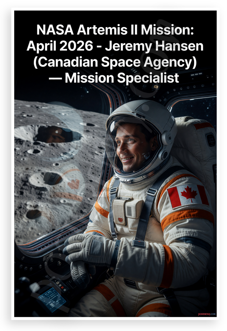 This 12x18 inch poster is printed on premium, durable paper. Proudly Made in the USA by PosterEnvy. The perfect size for any room. PosterEnvy is a family owned business, delivering top-notch posters around the world for over 20 years. Our posters are designed to last — they won't fade or pucker for years of enjoyment. Every poster features crisp, vivid artwork. We are a solar powered company. This striking poster depicts Canadian astronaut Jeremy Hansen of the Canadian Space Agency as Mission Specialist for NASA's Artemis II mission in April 2026, gazing at the lunar surface from the spacecraft window with a triumphant smile. Patriotic Canadian flag accents highlight national pride in space exploration.