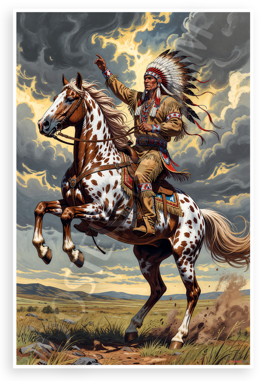 - Heroic Western Scene: Dramatic illustration of Native American warrior with war bonnet riding rearing Appaloosa horse under turbulent clouds and sunset plains, bold colors create epic mood for man cave, office or den