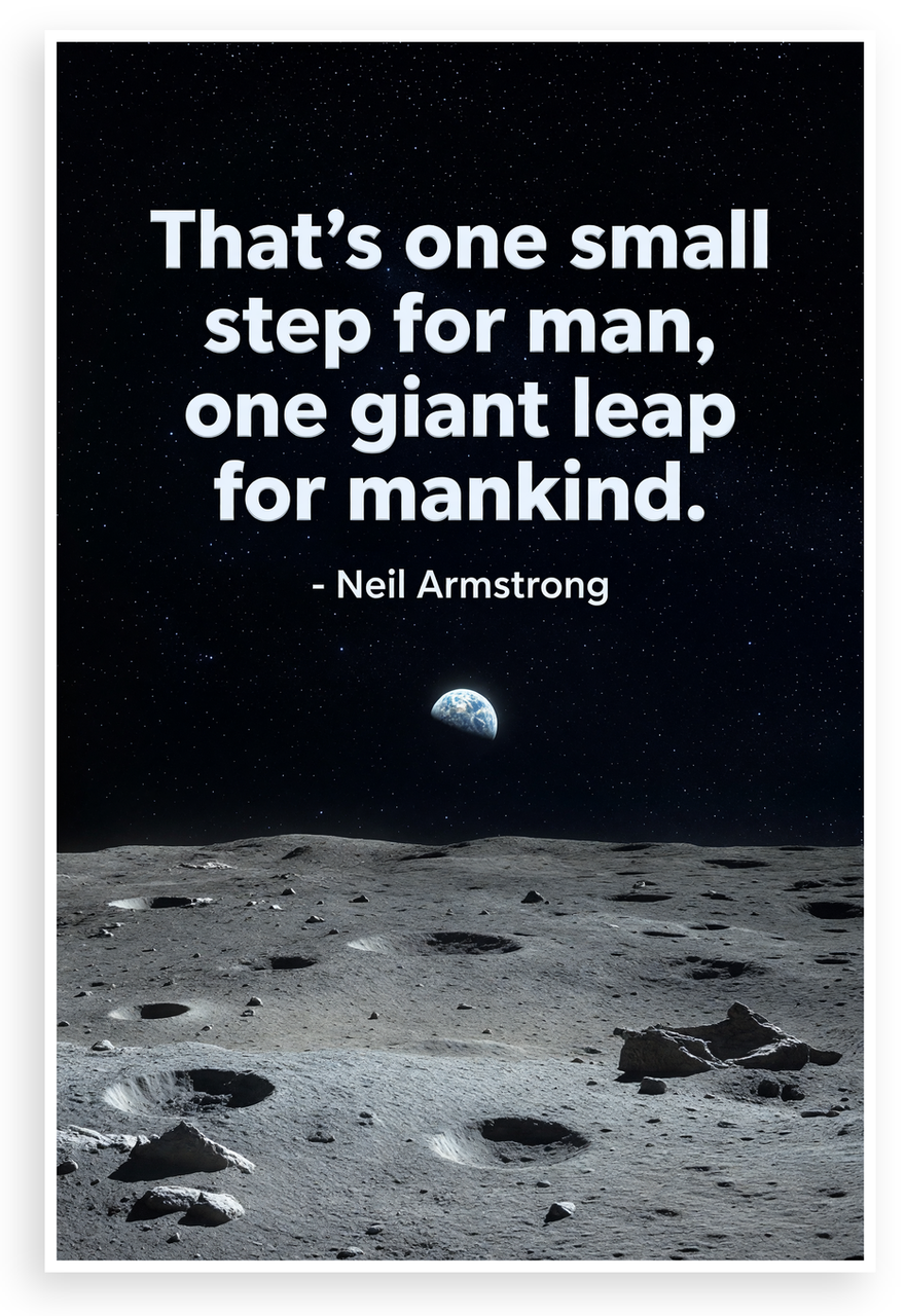 - Iconic Space Quote: Neil Armstrong's legendary words overlay a starry night sky, Earth above rugged moon craters and rocks, creating an awe-inspiring mood perfect for offices, dorms, or classrooms
