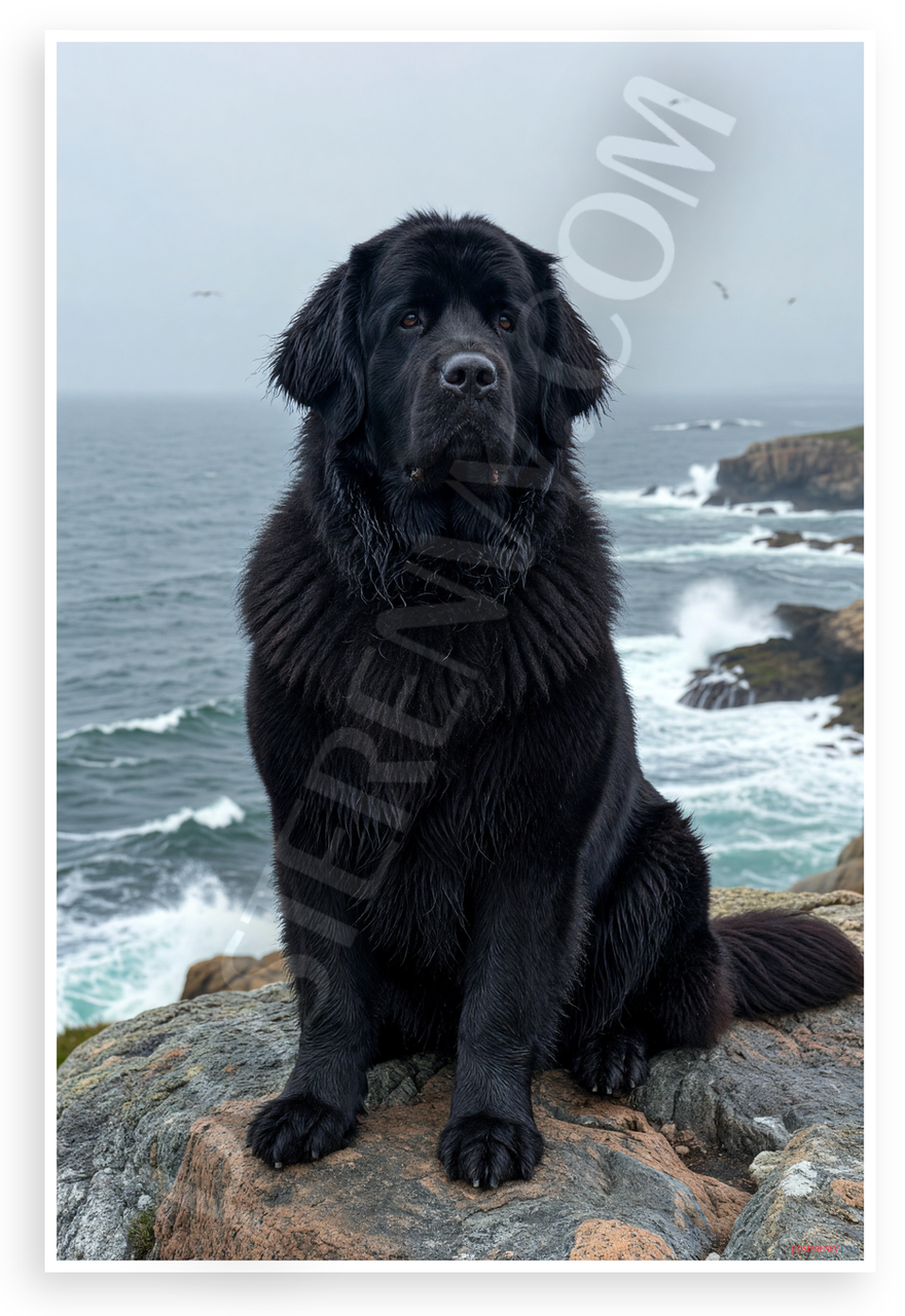 - Dramatic Coastal Scene: Majestic black Newfoundland dog sits alert on rugged rocks with turbulent ocean waves, misty sky, and seabirds; moody wildlife photography style perfect for living rooms, dens, or pet-themed spaces