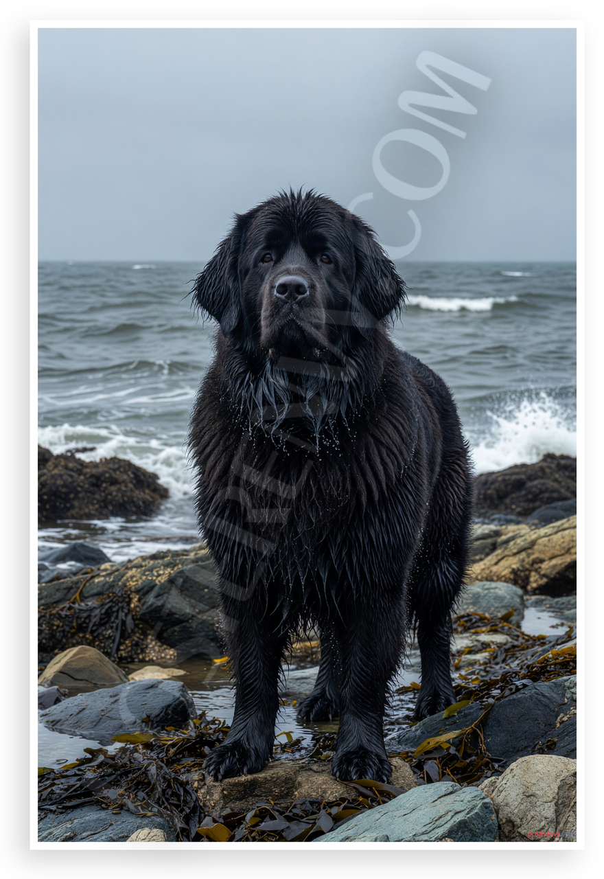 - Dramatic Coastal Scene: Majestic black Newfoundland dog stands wet and strong on rocky beach with crashing waves, gray skies, and seaweed; conveys loyalty and strength; ideal for living room, den, or pet lover space
