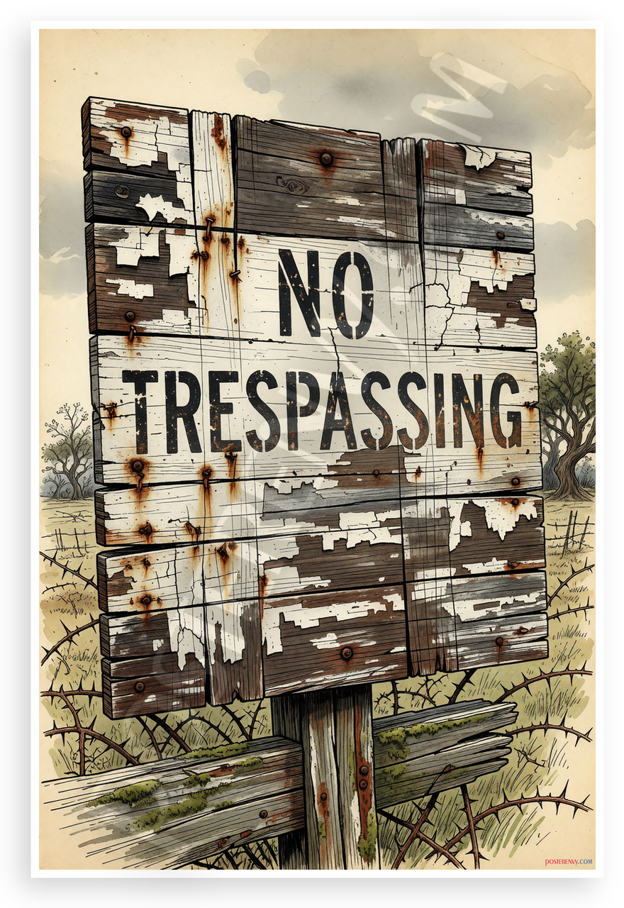 - Rustic Warning Sign Art: Detailed illustration of aged No Trespassing wooden sign with bold black letters, peeling paint, barbed wire fence, bare trees, and overcast sky for mysterious isolated mood. Ideal for man cave, garage, or outdoor-themed rooms