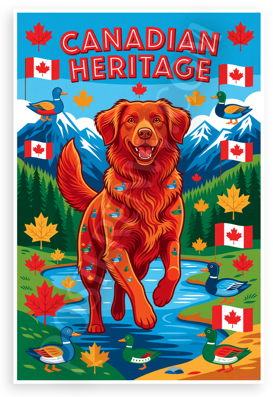 - Celebratory Canadian Design: Vibrant illustration showcases Nova Scotia Duck Tolling Retriever amid flags, maple leaves, ducks, peaks, and rivers in joyful mood, ideal for living room, den, or cabin