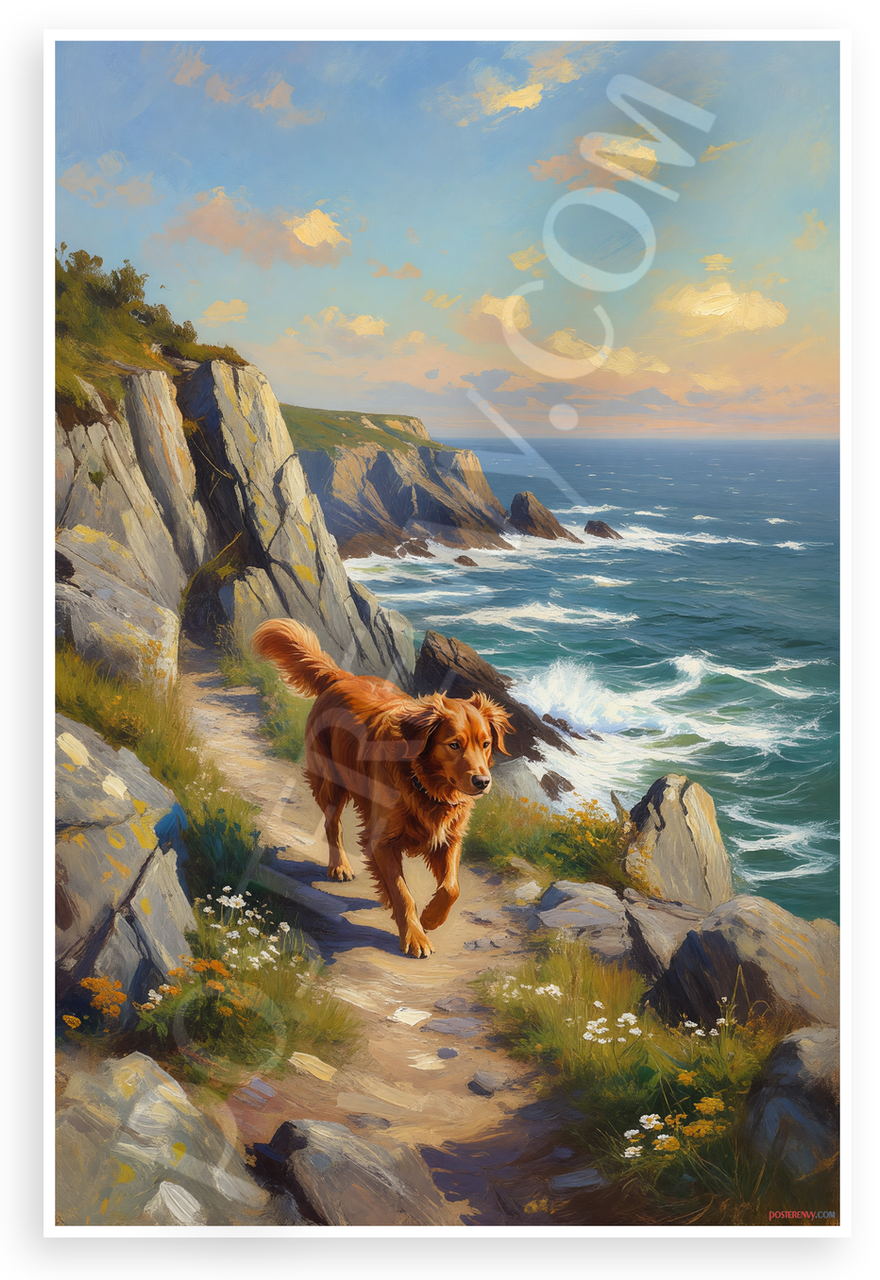 This 12x18 inch poster is printed on premium, durable paper. Proudly Made in the USA by PosterEnvy. The perfect size for any room. PosterEnvy is a family owned business, delivering top-notch posters around the world for over 20 years. Our posters are designed to last — they won't fade or pucker for years of enjoyment. Every poster features crisp, vivid artwork. We are a solar powered company. This impressionistic artwork captures a Nova Scotia Duck Tolling Retriever roaming a scenic coastal cliff path in Nova Scotia, with crashing ocean waves, rocky shores, wildflowers, and a golden sky evoking a nostalgic, free-spirited mood.