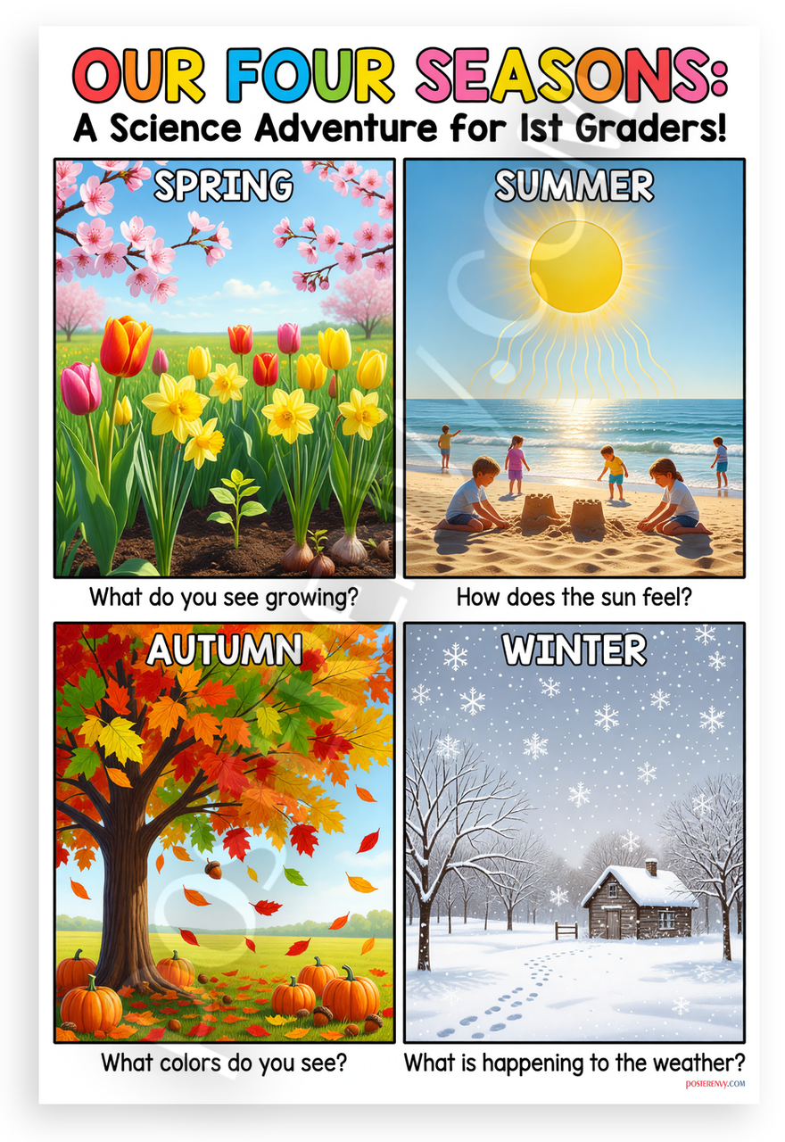 - Premium Print: This PosterEnvy 12x18 inch poster is printed on Durable, Heavy Duty Paper, Designed to last many years featuring four seasons science adventure for 1st graders with blooming flowers leaves pumpkins snow