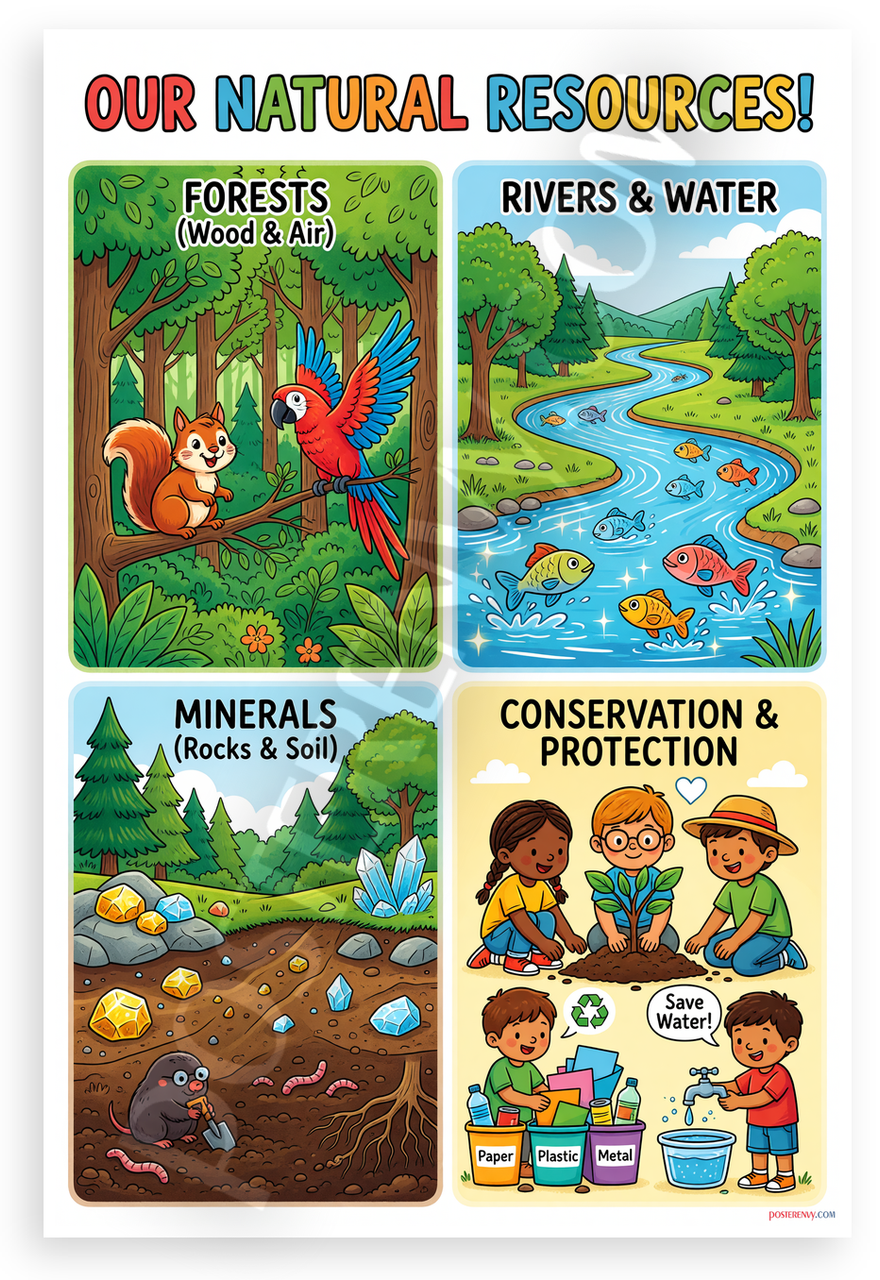 This 12x18 inch poster is printed on premium, durable paper. Proudly Made in the USA by PosterEnvy. The perfect size for any room. PosterEnvy is a family owned business, delivering top-notch posters around the world for over 20 years. Our posters are designed to last — they won't fade or pucker for years of enjoyment. Every poster features crisp, vivid artwork. We are a solar powered company. This vibrant educational poster illustrates natural resources like forests (wood & air), rivers & water, minerals (rocks & soil), and conservation efforts with diverse children recycling and saving water. Ideal for young learners exploring the environment.