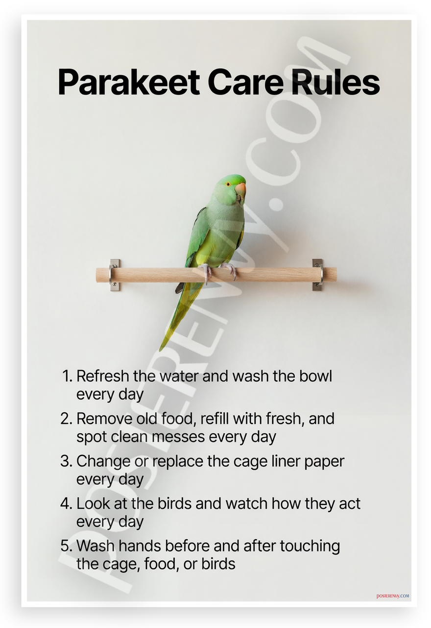 - Essential Bird Care Guide: Modern minimalist poster shows green parakeet on wooden perch with 5 key daily rules for water, food, cleaning, observation, hygiene; warm mood perfect for kitchens, vet offices, kids rooms
