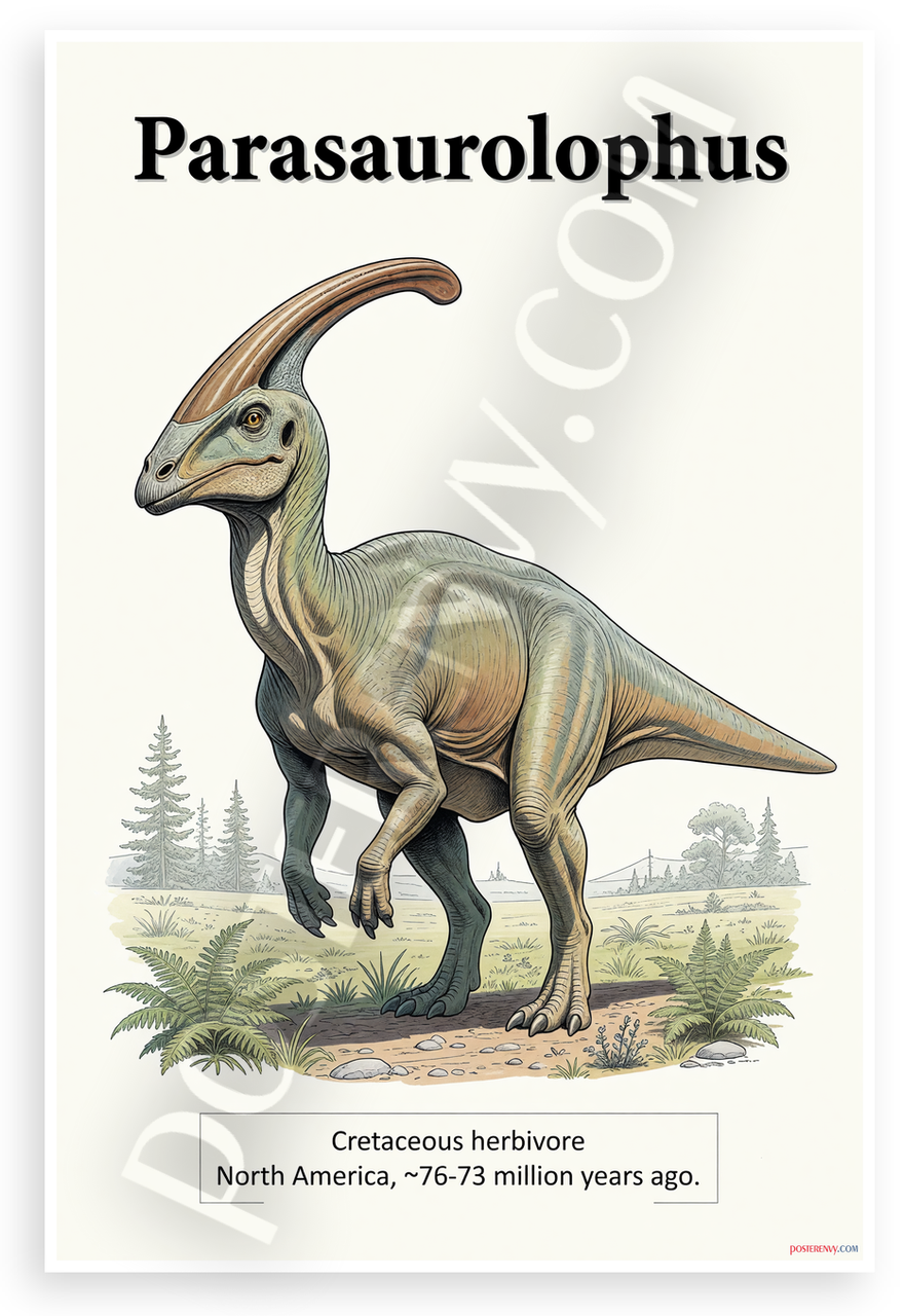 - Premium Print: This PosterEnvy 12x18 inch poster is printed on Durable, Heavy Duty Paper, Designed to last many years. Features detailed Parasaurolophus dinosaur illustration with educational facts on Cretaceous herbivore from North America.