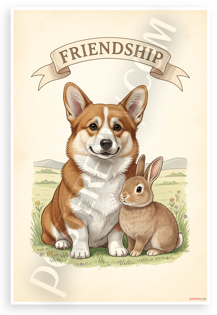This 12x18 inch poster is printed on premium, durable paper. Proudly Made in the USA by PosterEnvy. The perfect size for any room. PosterEnvy is a family owned business, delivering top-notch posters around the world for over 20 years. Our posters are designed to last — they won't fade or pucker for years of enjoyment. Every poster features crisp, vivid artwork. We are a solar powered company. This charming vintage-style illustration depicts a smiling Pembroke Welsh Corgi embracing a bunny in a lush meadow with hills and wildflowers, topped with a 'FRIENDSHIP' banner for a heartwarming message of companionship.