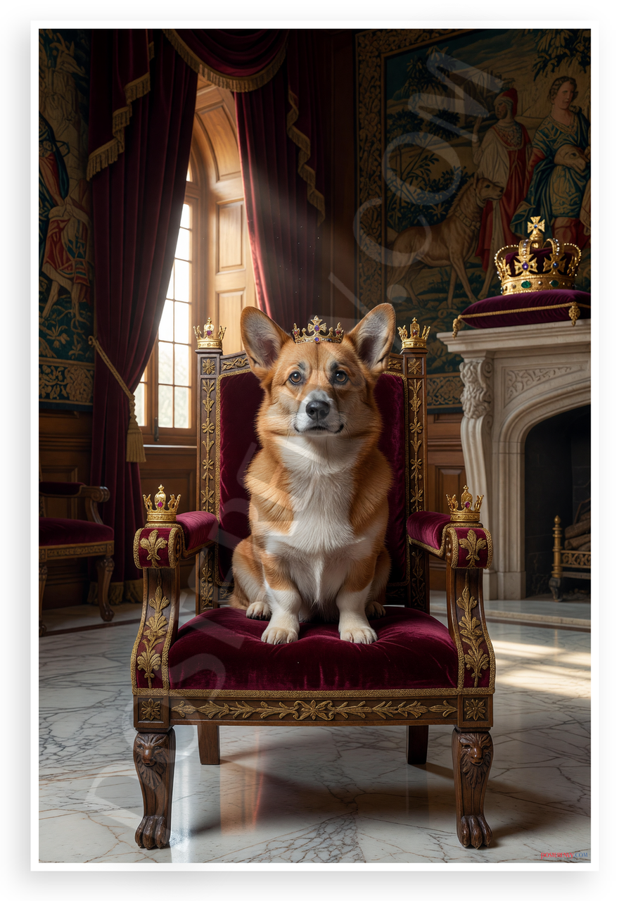 - Regal Royal Fantasy: A Pembroke Welsh Corgi wearing a crown sits majestically on a carved wooden throne in a lavish chamber with rich red drapes, stone fireplace, and gilded details. Ideal for living rooms, bedrooms, or pet-themed spaces