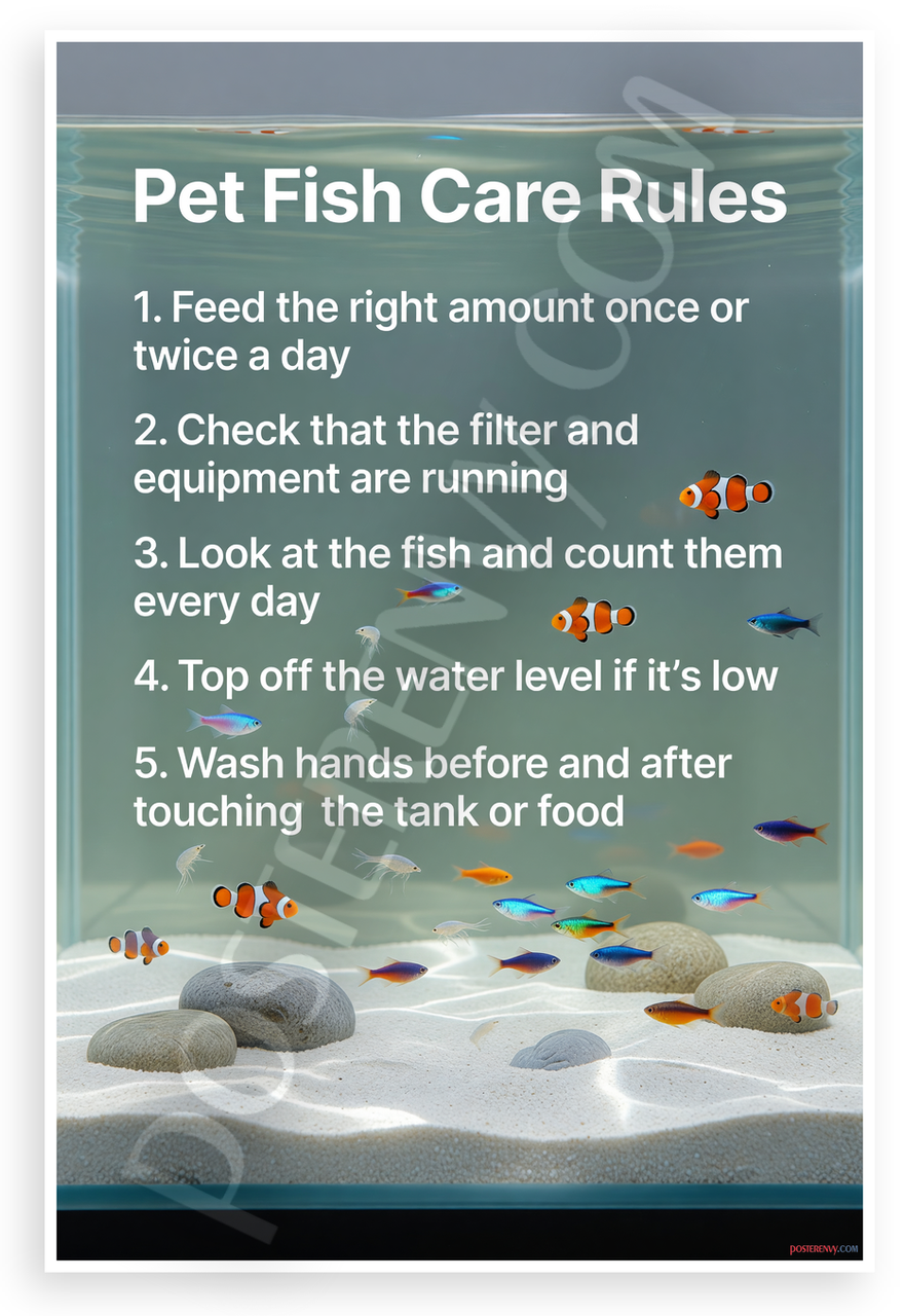 This 12x18 inch poster is printed on premium, durable paper. Proudly Made in the USA by PosterEnvy. The perfect size for any room. PosterEnvy is a family owned business, delivering top-notch posters around the world for over 20 years. Our posters are designed to last — they won't fade or pucker for years of enjoyment. Every poster features crisp, vivid artwork. We are a solar powered company. This educational poster displays essential pet fish care rules in a serene aquarium scene with colorful clownfish, tetras, and shrimp amid rocks and sand. Ideal for teaching responsible aquarium maintenance.