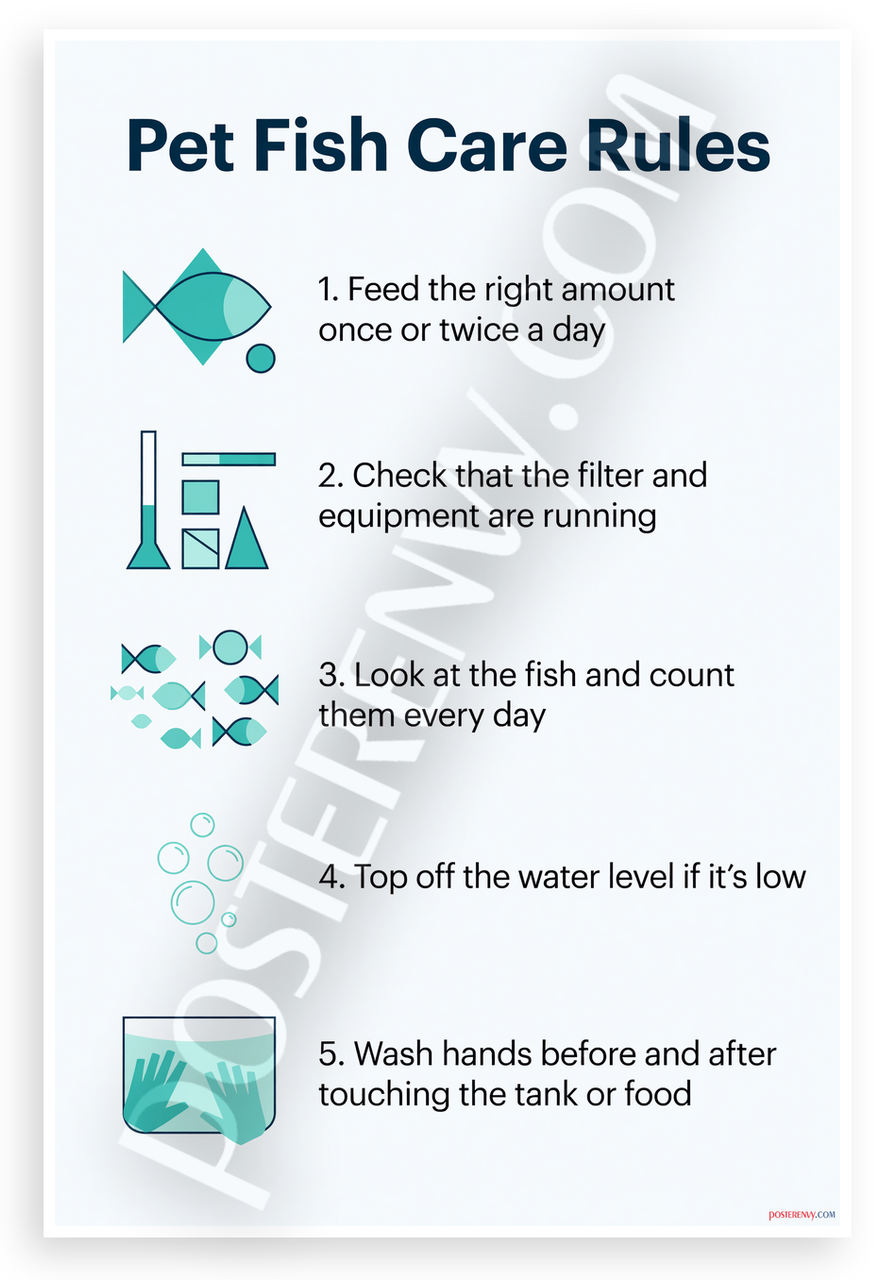 - Premium Print: This PosterEnvy 12x18 inch poster is printed on Durable, Heavy Duty Paper, Designed to last many years. Pet Fish Care Rules infographic with feeding guidelines, filter checks, fish counting, water top-off, hand washing icons