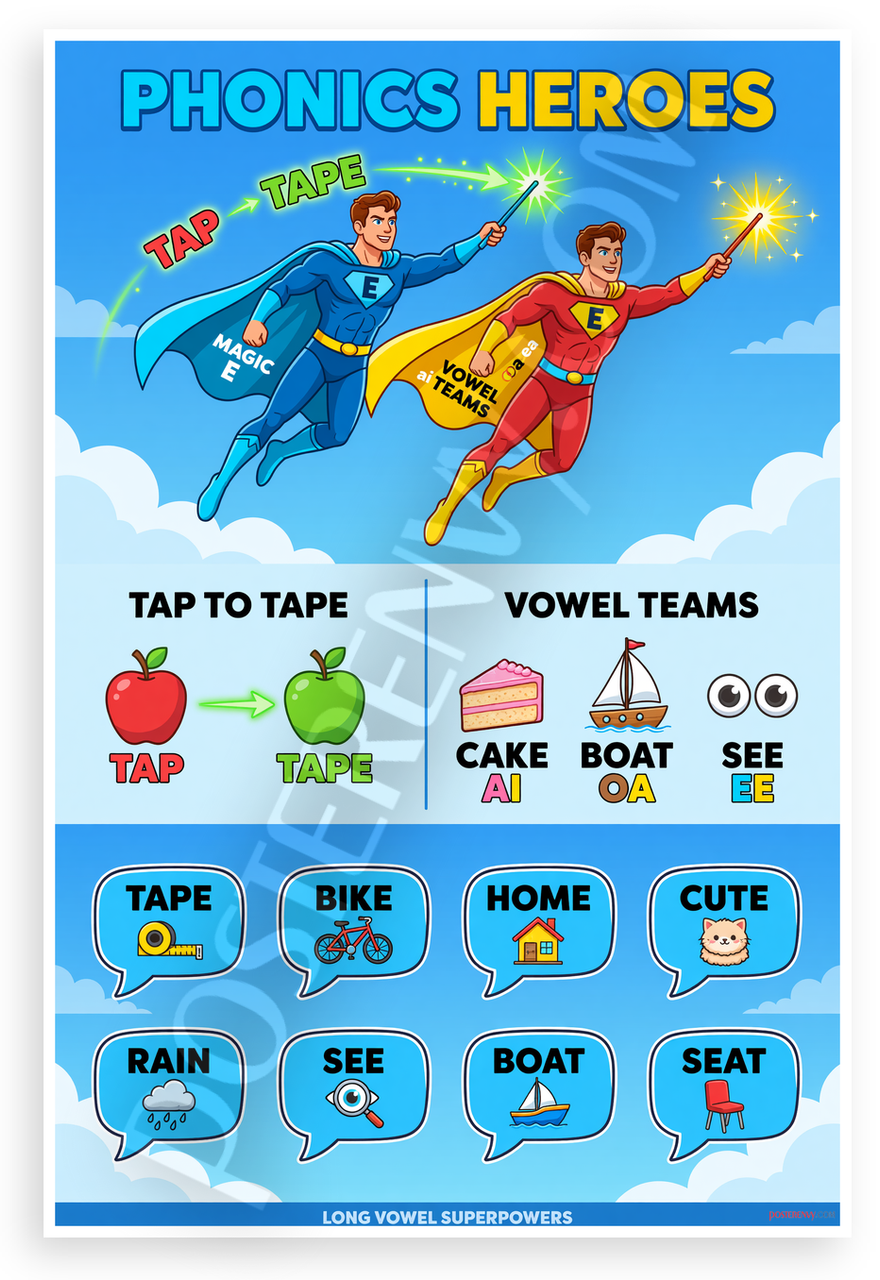 - Fun Phonics Learning: Vibrant cartoon superheroes with Magic E and Vowel Teams teach long vowel sounds through playful examples and speech bubbles ideal for classroom homeschool study areas