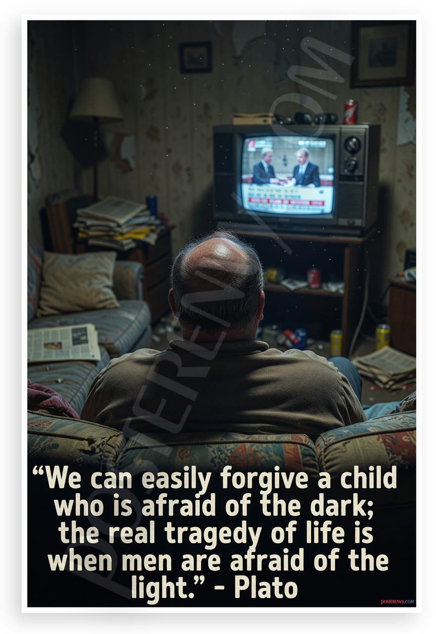 This 12x18 inch poster is printed on premium, durable paper. Proudly Made in the USA by PosterEnvy. The perfect size for any room. PosterEnvy is a family owned business, delivering top-notch posters around the world for over 20 years. Our posters are designed to last — they won't fade or pucker for years of enjoyment. Every poster features crisp, vivid artwork. We are a solar powered company. This evocative poster depicts a balding man from behind, seated in a dimly lit, cluttered living room watching news on an old TV amid scattered cans and papers, symbolizing fear of enlightenment. The powerful Plato quote overlays the moody, atmospheric scene in a distressed font.