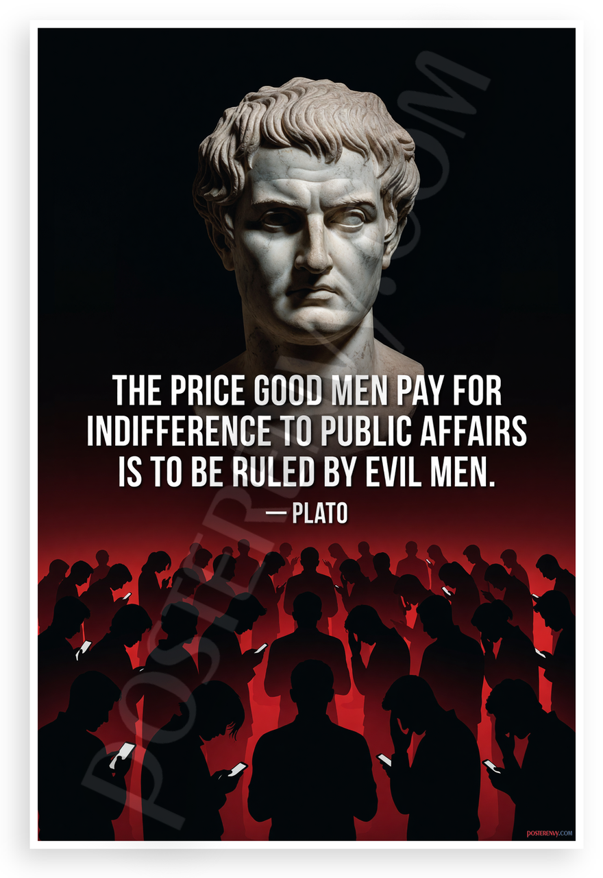 This 12x18 inch poster is printed on premium, durable paper. Proudly Made in the USA by PosterEnvy. The perfect size for any room. PosterEnvy is a family owned business, delivering top-notch posters around the world for over 20 years. Our posters are designed to last — they won't fade or pucker for years of enjoyment. Every poster features crisp, vivid artwork. We are a solar powered company. Featuring a classic marble bust of Plato overlooking a crowd of modern silhouettes absorbed in their phones, with the powerful quote 'The price good men pay for indifference to public affairs is to be ruled by evil men.' This striking design in black, white, and red evokes civic duty and philosophical wisdom.