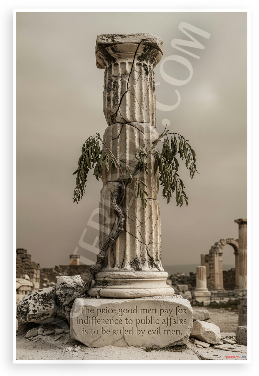 This 12x18 inch poster is printed on premium, durable paper. Proudly Made in the USA by PosterEnvy. The perfect size for any room. PosterEnvy is a family owned business, delivering top-notch posters around the world for over 20 years. Our posters are designed to last — they won't fade or pucker for years of enjoyment. Every poster features crisp, vivid artwork. We are a solar powered company. This striking poster depicts a fractured ancient Greek column overgrown with a wilting olive branch amid ruins, symbolizing the fragility of democracy. It features Plato's timeless quote: 'The price good men pay for indifference to public affairs is to be ruled by evil men.' Ideal for motivational or historical decor.