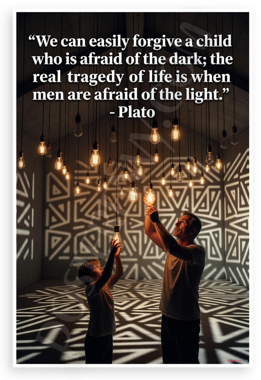 This 12x18 inch poster is printed on premium, durable paper. Proudly Made in the USA by PosterEnvy. The perfect size for any room. PosterEnvy is a family owned business, delivering top-notch posters around the world for over 20 years. Our posters are designed to last — they won't fade or pucker for years of enjoyment. Every poster features crisp, vivid artwork. We are a solar powered company. This striking inspirational poster features Plato's profound quote on fear and truth, illustrated with a father and son reaching for glowing light bulbs amid geometric shadows and warm illumination, evoking themes of knowledge, innocence, and courage.